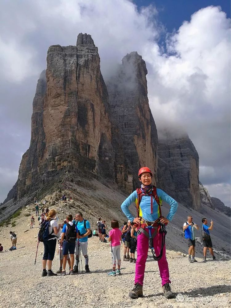 下车就有两个当地意大利向导迎接我们,每人一幅扁带、安全锁、安全帽,大家全副武装后出发。沿着坡度不大的山路,徒步一个小时后到达三峰山脚下,可目标不是三峰山,而是对面的那座犬齿交错、壁立千仞的山峰,我们今天就是要在这高高的山峰上体验铁索攀岩活动,感受一下在高山崖壁上飞的快感。爬升前先在三峰下留个影,展示一下我的飒爽英姿。