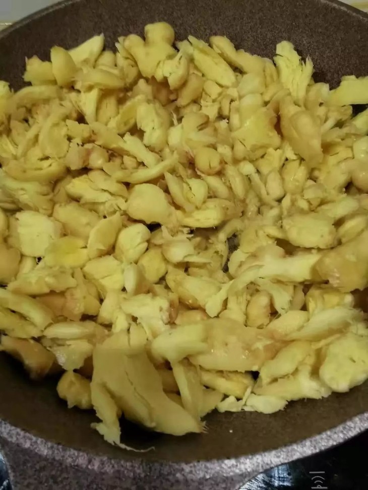 2.砂锅烧热,将拍碎的姜倒入锅中翻炒,除去生姜表面水分即可。