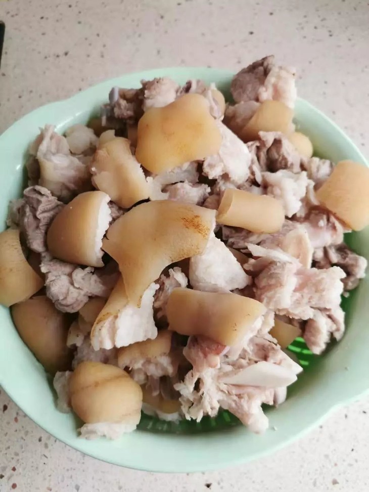 5.清洗猪脚后凉水下锅,将猪脚焯水后用流动水洗去血沫,将猪脚控水后放入砂锅里。