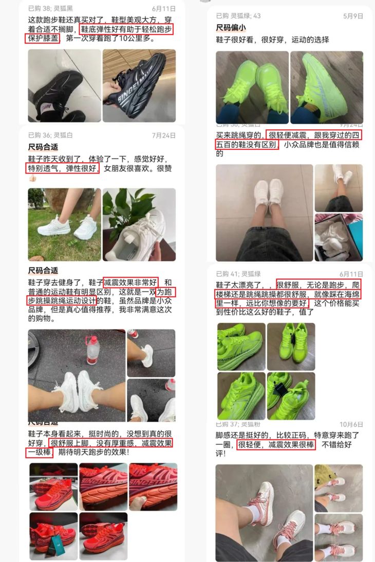 “鞋底弹性好,有助于轻松跑步保护膝盖”、“就像踩在海绵里一样”