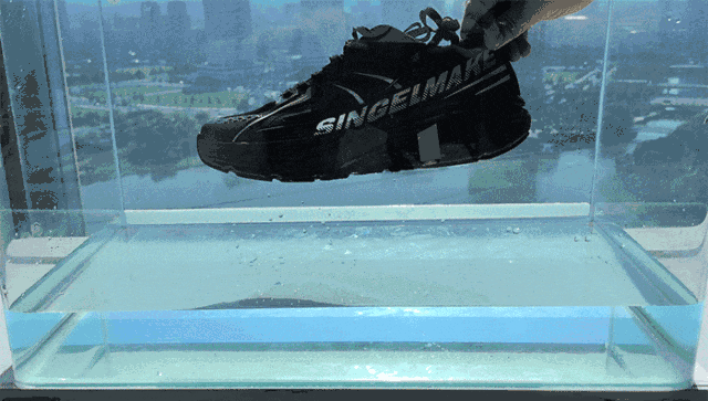 小编将它放在一块光滑倾斜的平板上,往上浇水,怎么推鞋子都不会滑下去。