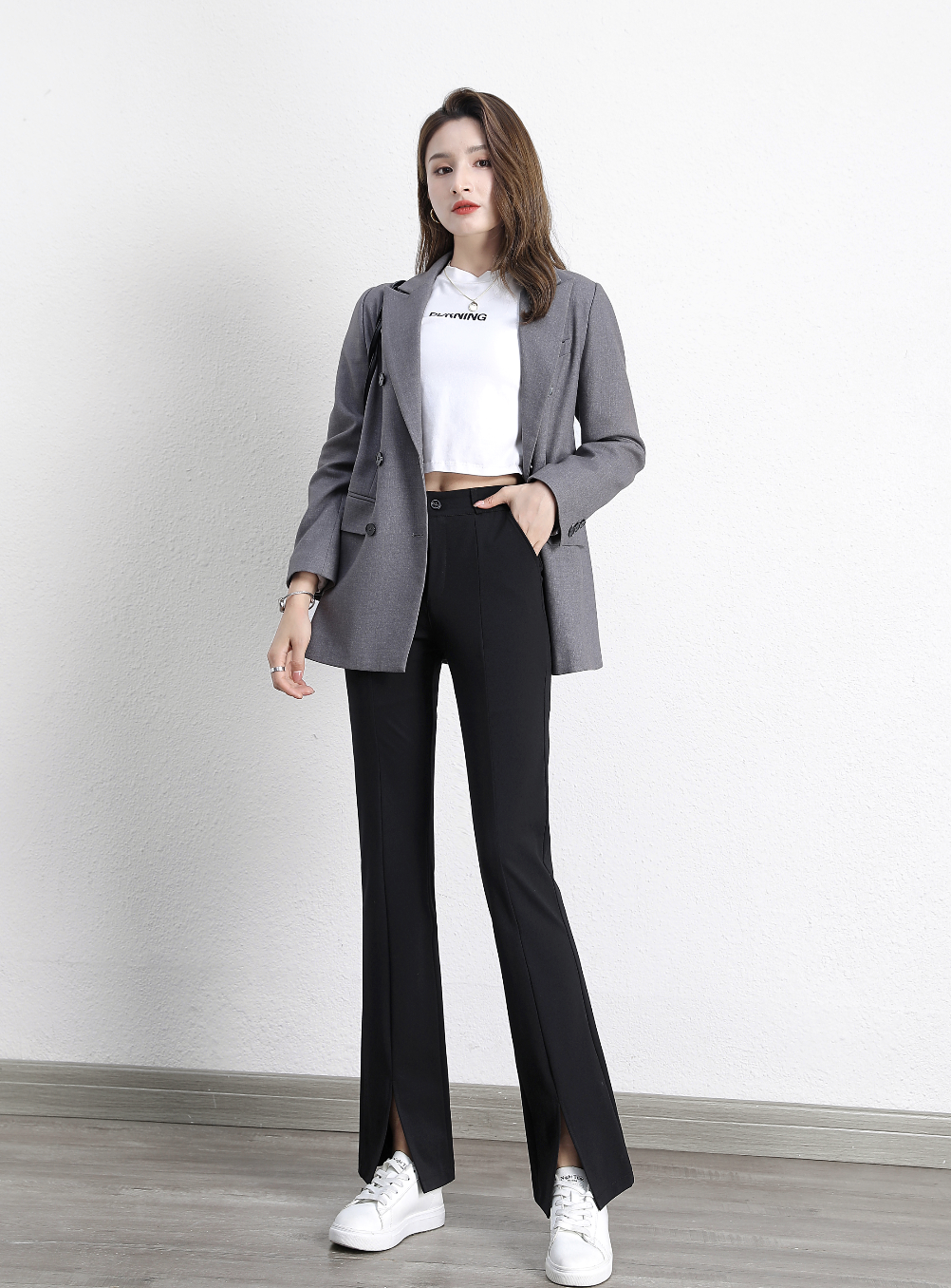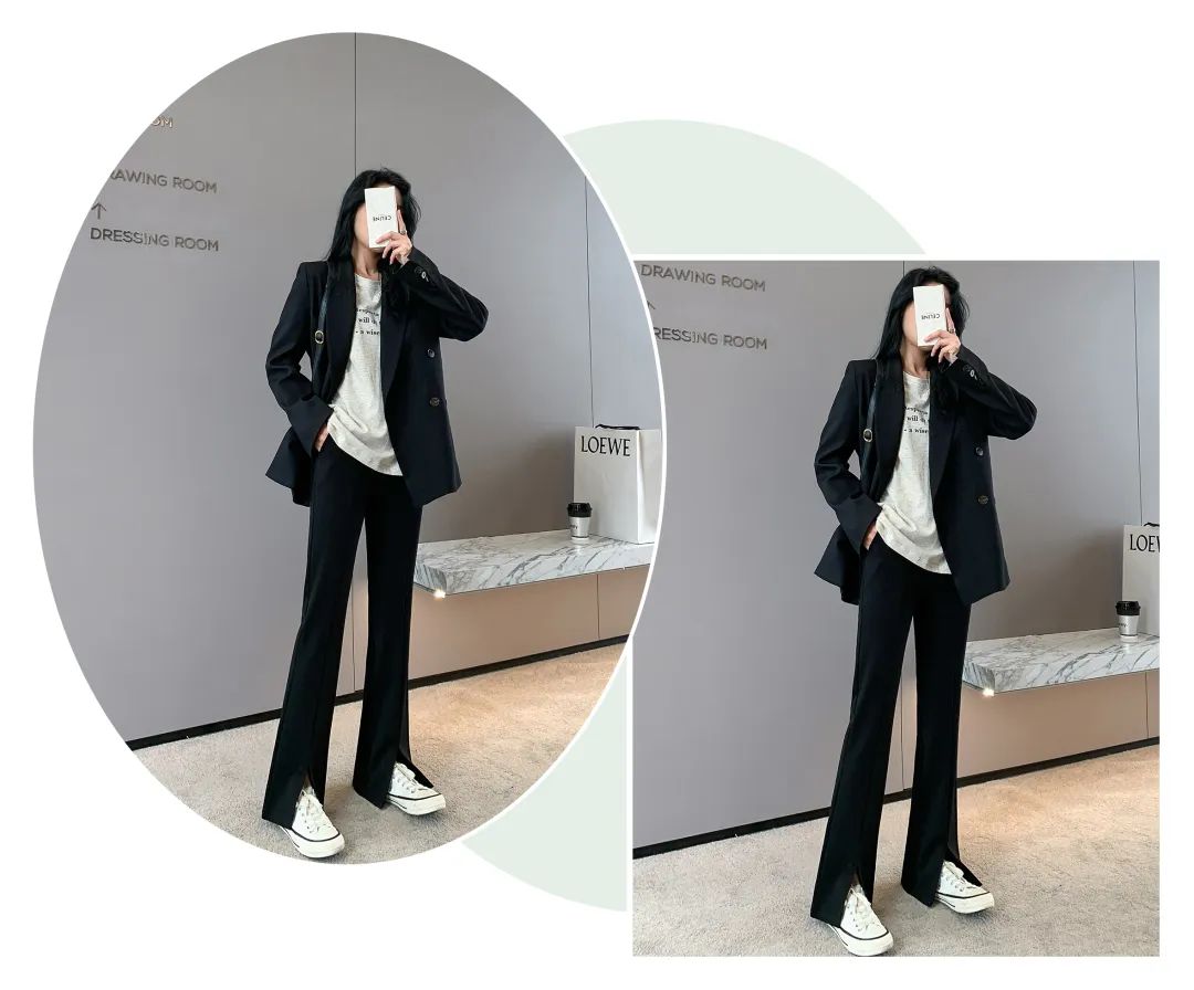秋冬呢,简单搭上一件纯色打底再披上一件休闲西装, 特别有一心搞事业的大女主气质,稳重又不失气质。微高腰的设计,刚好没过脚踝的长度, 不会过于拖沓,又能在视觉上更是延长了小腿的长度。这种裤子特别适合脚踝粗的女生,自带三角分割,感觉脚踝就只有露出来的那么细似的。