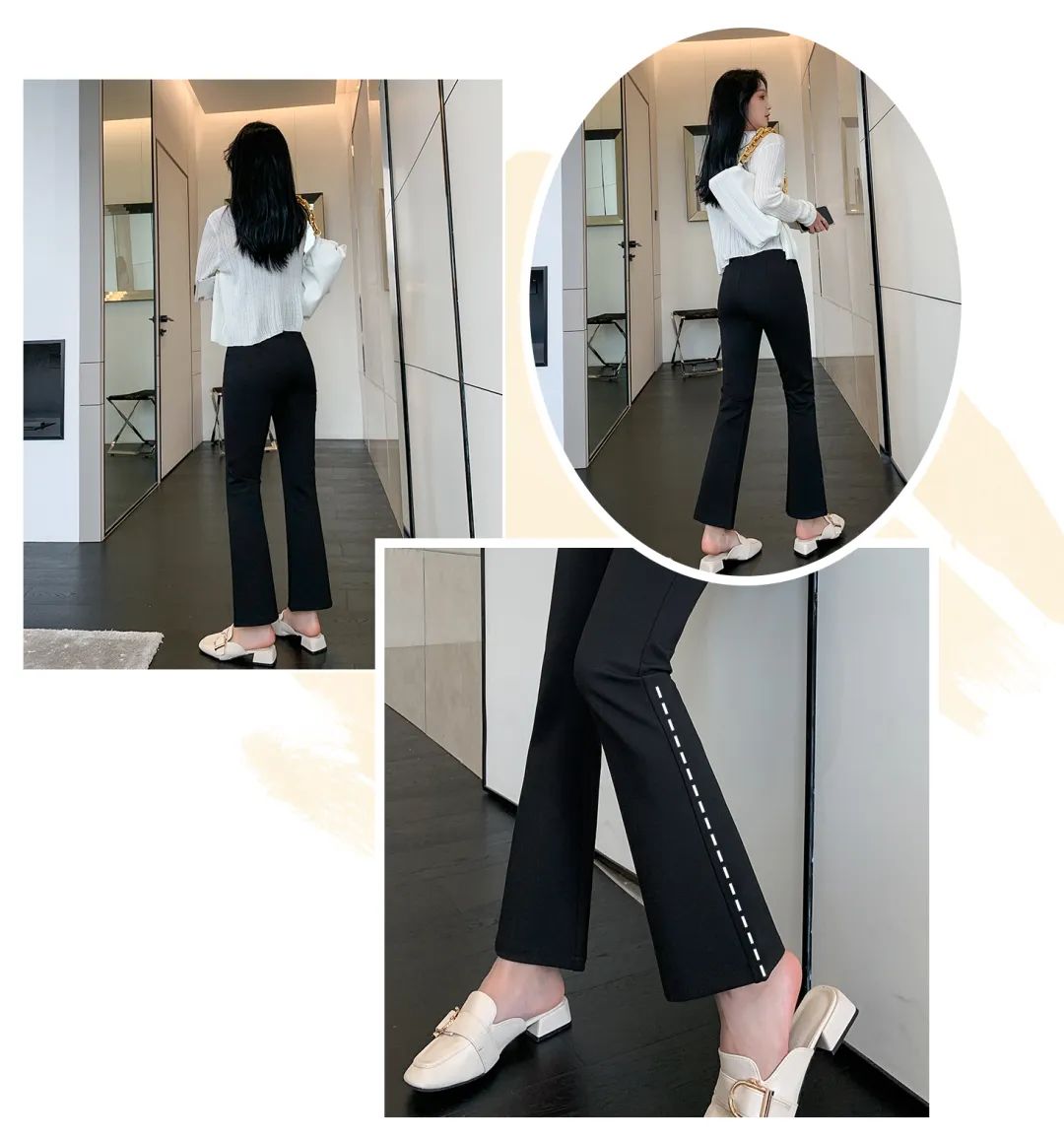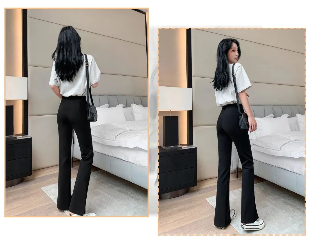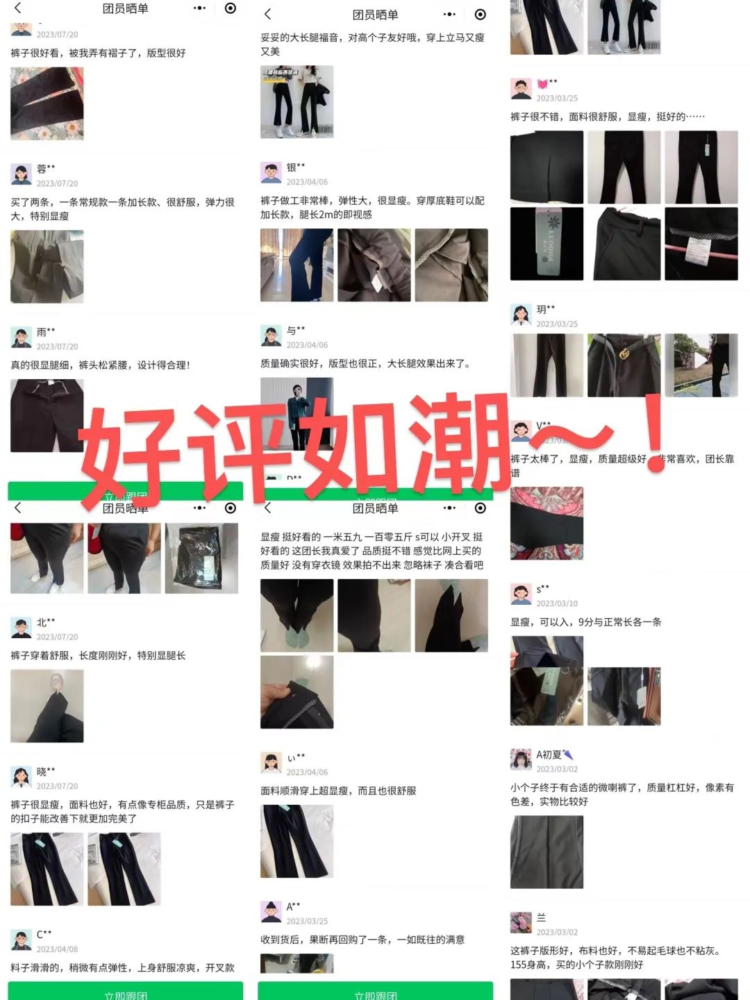 侧面看小腹部分不会像别的裤子一样鼓起来一块,非常平整。裤子 后面是松紧腰,隐藏式设计,不影响美观,包容性又非常好~有小肚子都不怕!包括各个细节也非常有匠人精神,工艺制作上也十分用心,裤子内里做了 包边设计,避免脱线问题~整体看起来更加干净利索, 完完全全就是大牌的做工,穿上几年完全ok。弹性好!下蹲、上跳,没一点障碍,从80斤-144斤都可以穿!透气性也是一绝,春天穿很舒服,夏天穿着也不会闷热,如同走路带风,英姿飒爽。平整的走线以及有质感的面料,上身后立马穿出一种高级感。上身后就像大瀑布一般猛然垂下, 把肉悄悄藏在了“水帘洞”里~设计简约大气,灰常百搭,属于穿10年都不会过时的那种。一条喇叭裤就能穿四季,没有天气的限制,想怎么搭配就怎么搭配。【开叉九分款】+【不开叉九分款】建议165cm以下身高。以上身高的建议,实际以个人身材比例而定哈,裤子包容性很好不挑身材的。软磨硬泡半个月,向品牌争取到了超优惠的价格,两位数就可以拥有它啦。