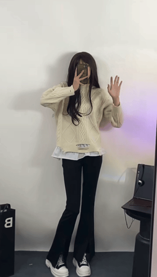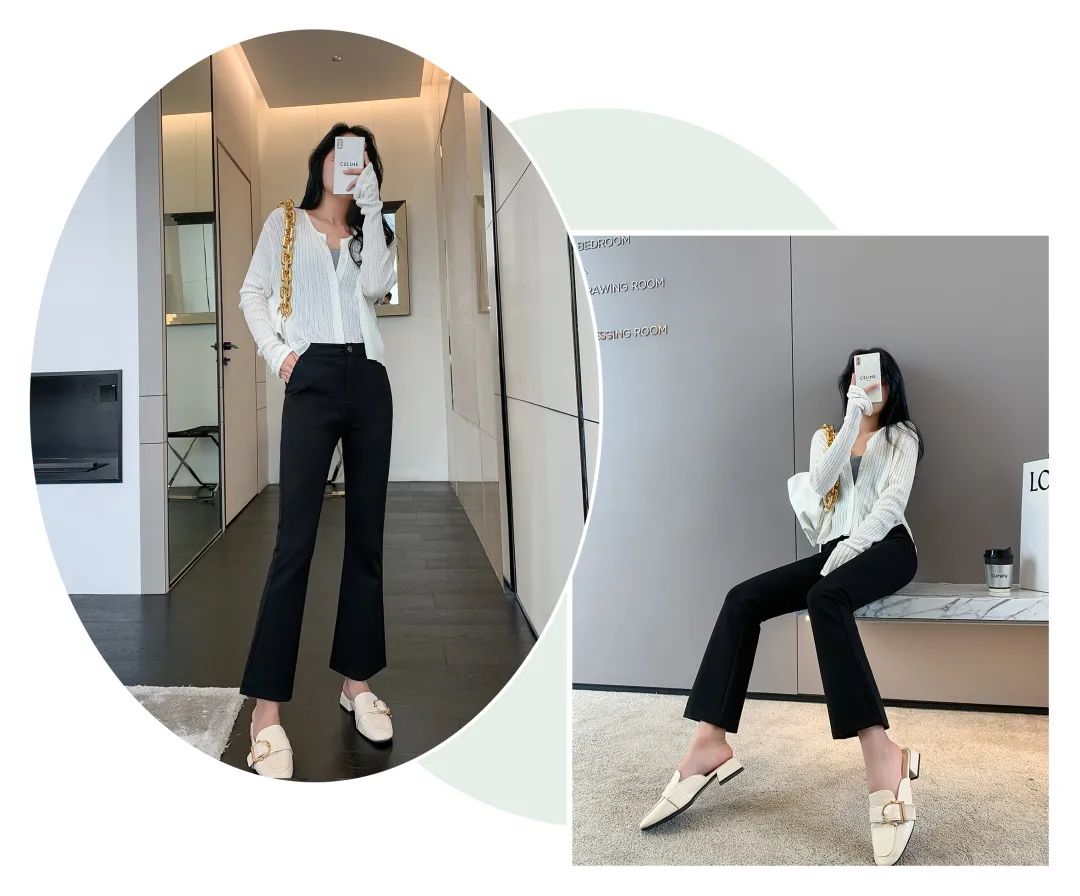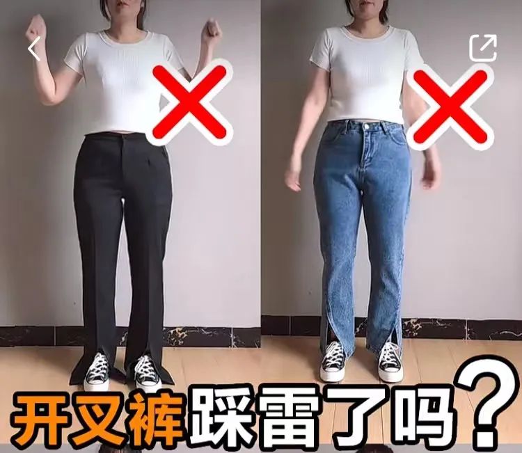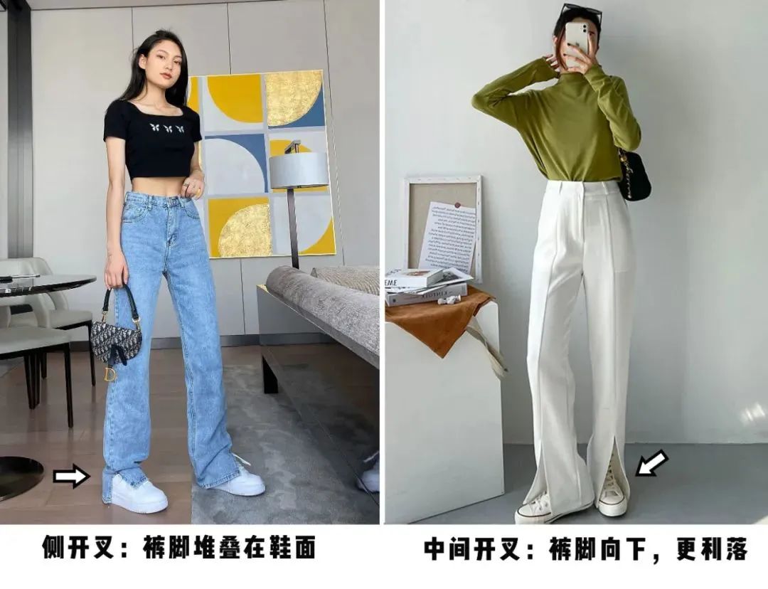 我建议你们买中间开叉的,后裤脚笔直的垂下来盖住鞋后跟,等于给小腿来了个延长,看着更显高。注意的是不要买小腿紧身+开叉的款式,除非你是细长直,要不然很难看。有很多女生之所以觉得喇叭裤驾驭起来很困难 ,是因为没有根据身高选择符合长度的。很多人都觉得长款拖地的喇叭裤会更有港式复古风的气质。但是如果身高上不占有优势, 千万不要选择完全盖住脚面的长度,那样会显得邋里邋遢。所以今天推荐的这款微喇裤真的很细节啦, 设计了九分裤和常规款,以满足不同身高姐妹需求~