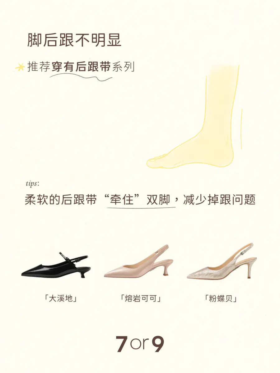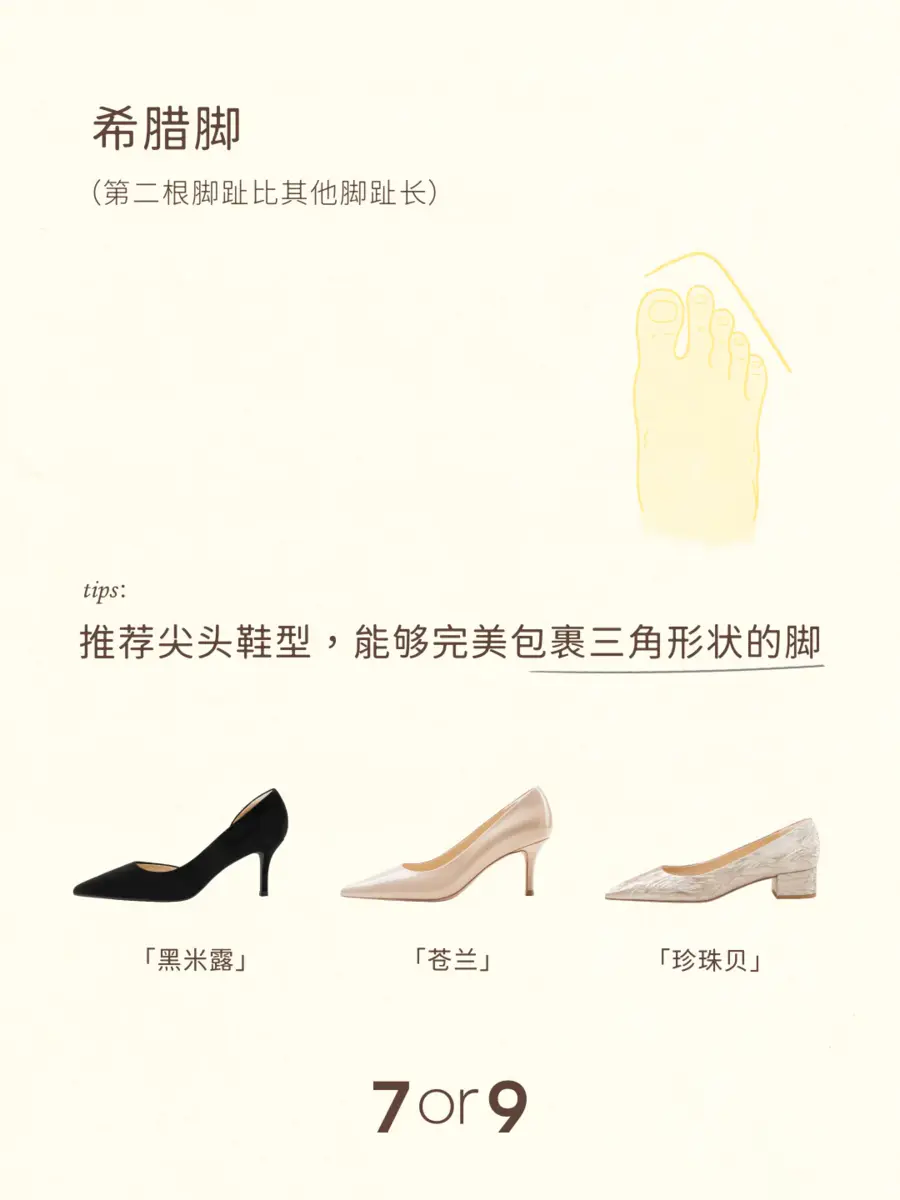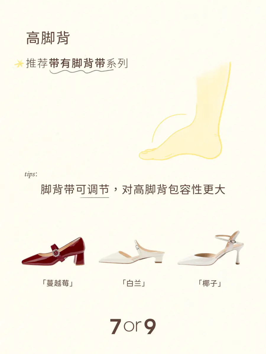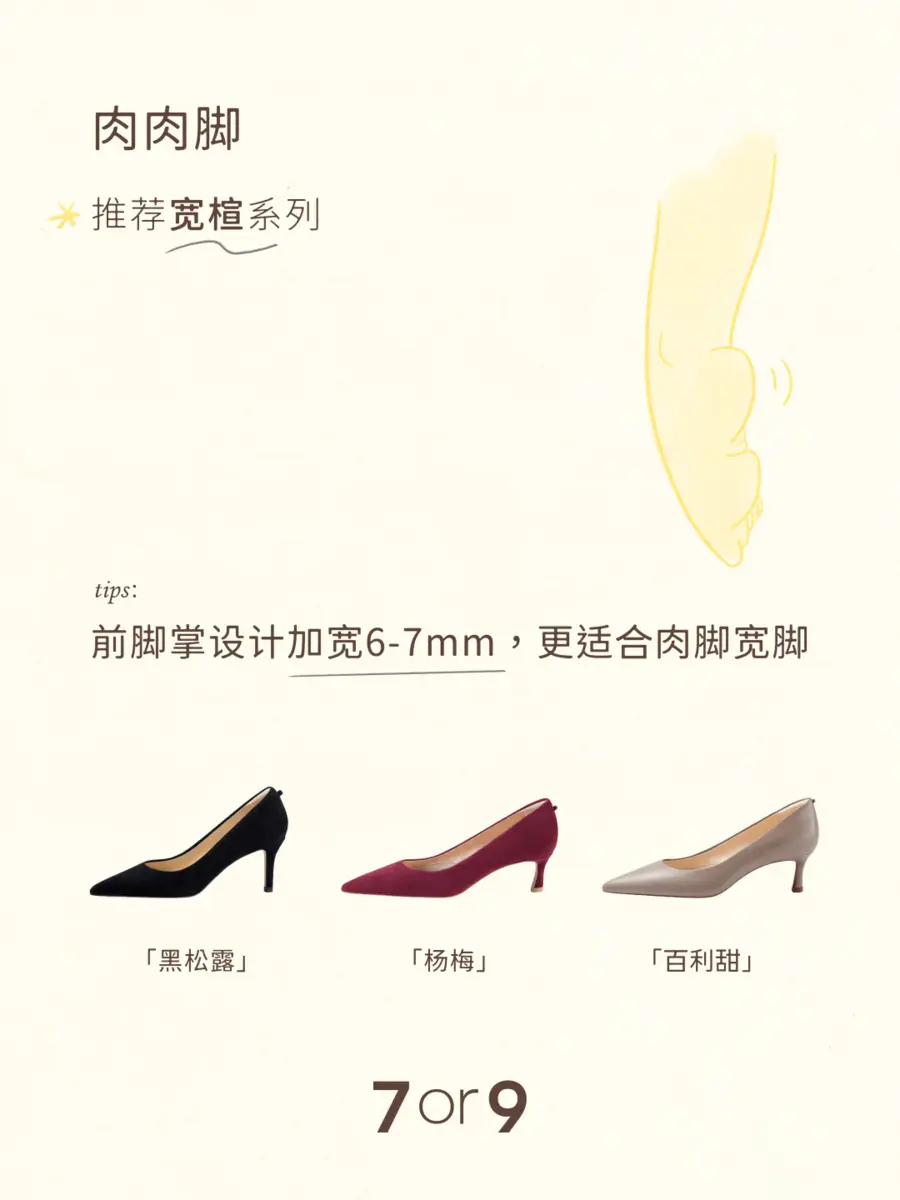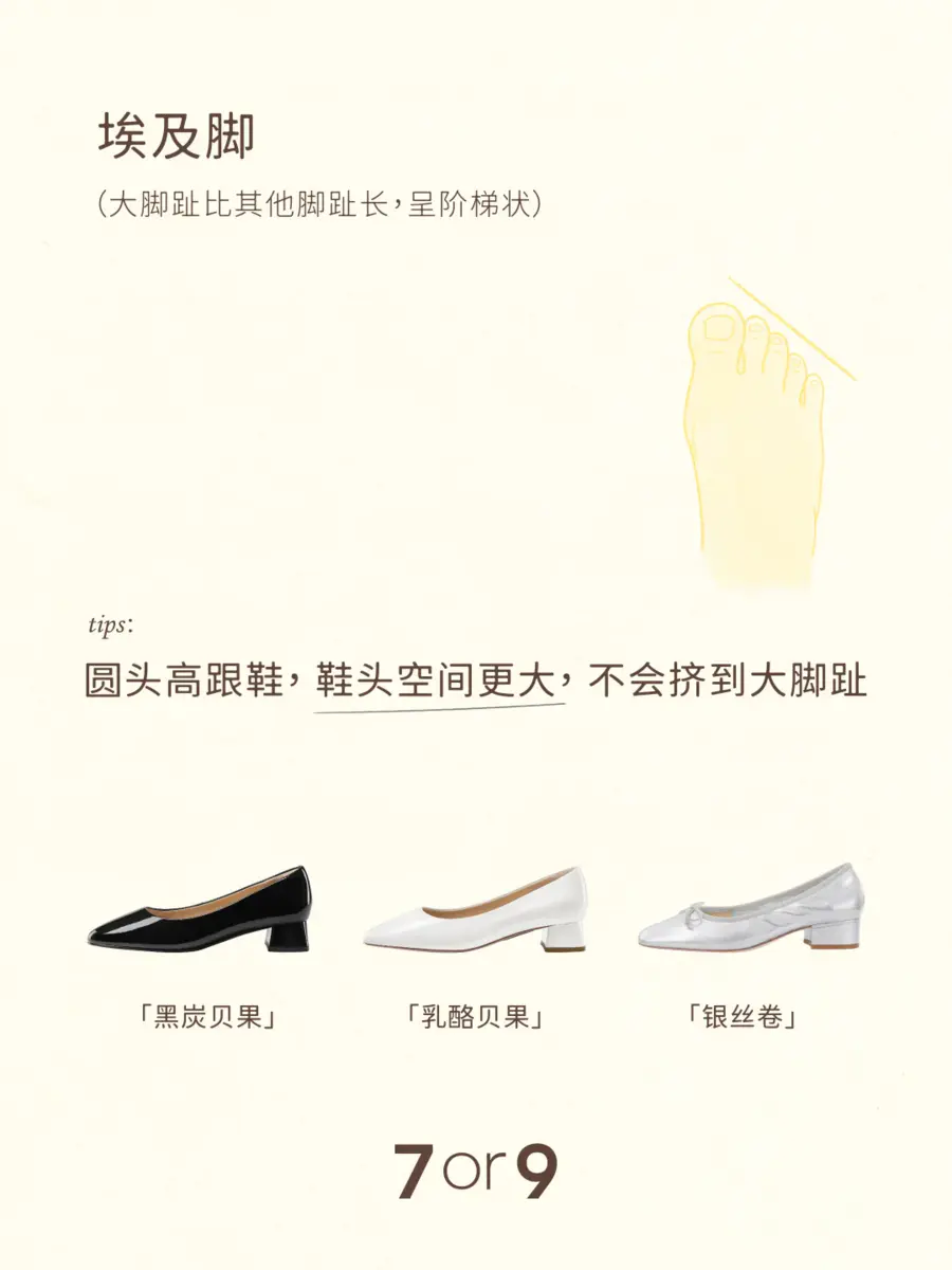 不同的脚型怎么选合适的高跟鞋?以下有一些小tips,希望可以帮助你选出那双好看也好穿的高跟鞋。👇 1️⃣肉肉脚:推荐宽楦系列 相较于标准版,宽楦系列前脚掌设计加宽6-7mm,更适合肉脚宽脚。 「杨梅」「黑松露」「百利甜」 2️⃣高脚背:推荐带有脚背带系列 脚背带充棉设计,柔软亲肤;可调节,对高脚背包容性更大。 「蔓越莓」「白兰」「椰子」 3️⃣后脚跟不明显:推荐穿有后跟带系列 柔软的后跟带“牵住”双脚,减少掉跟问题。 「熔岩可可」「大溪地」「粉蝶贝」 4️⃣埃及脚(大脚趾比其他脚趾长,呈阶梯状) 推荐圆头高跟鞋,鞋头空间更大,不会挤到大脚趾。 「乳酪贝果」「银丝卷」「黑炭贝果」 5️⃣希腊脚(第二根脚趾比其他脚趾长) 推荐尖头鞋型,能够完美包裹三角形状的脚。 「珍珠贝」「黑米露」「苍兰」 6️⃣罗马脚(脚趾几乎呈直线排列) 与方形鞋头匹配度高。 「黑凤梨」「优格」「杏仁露」