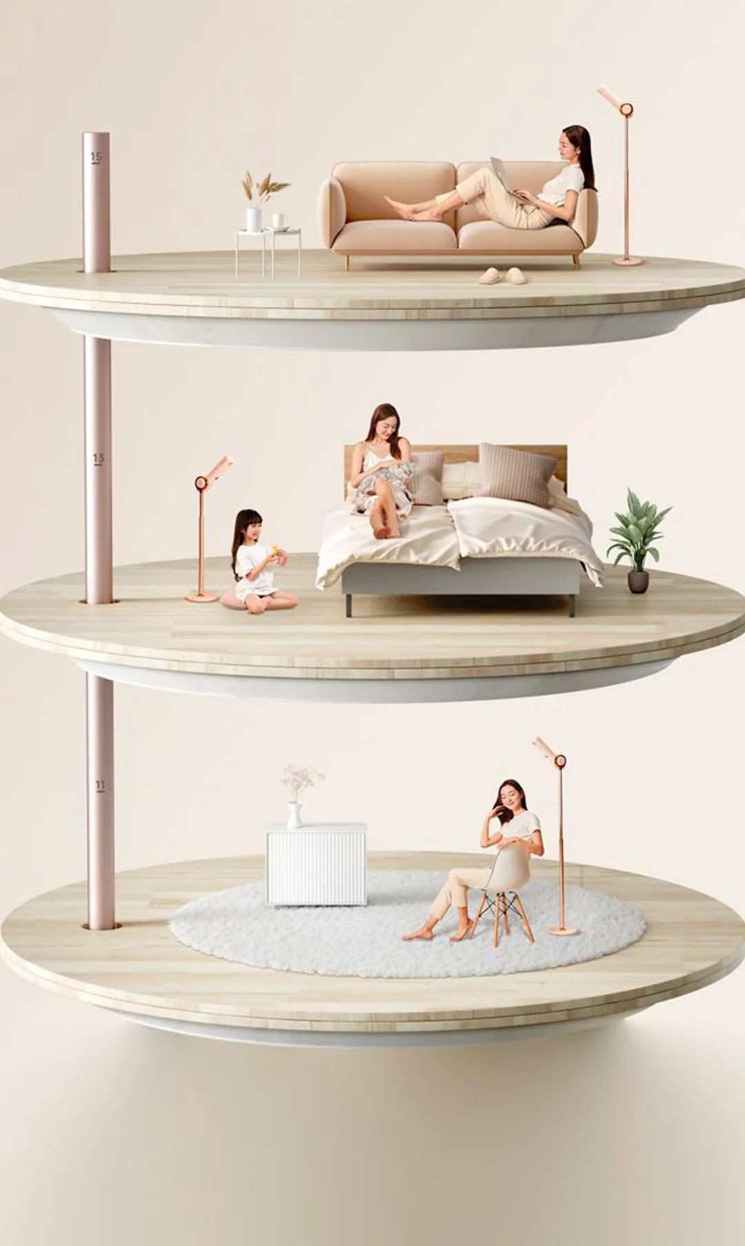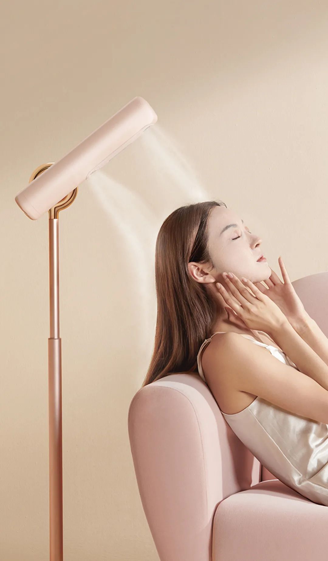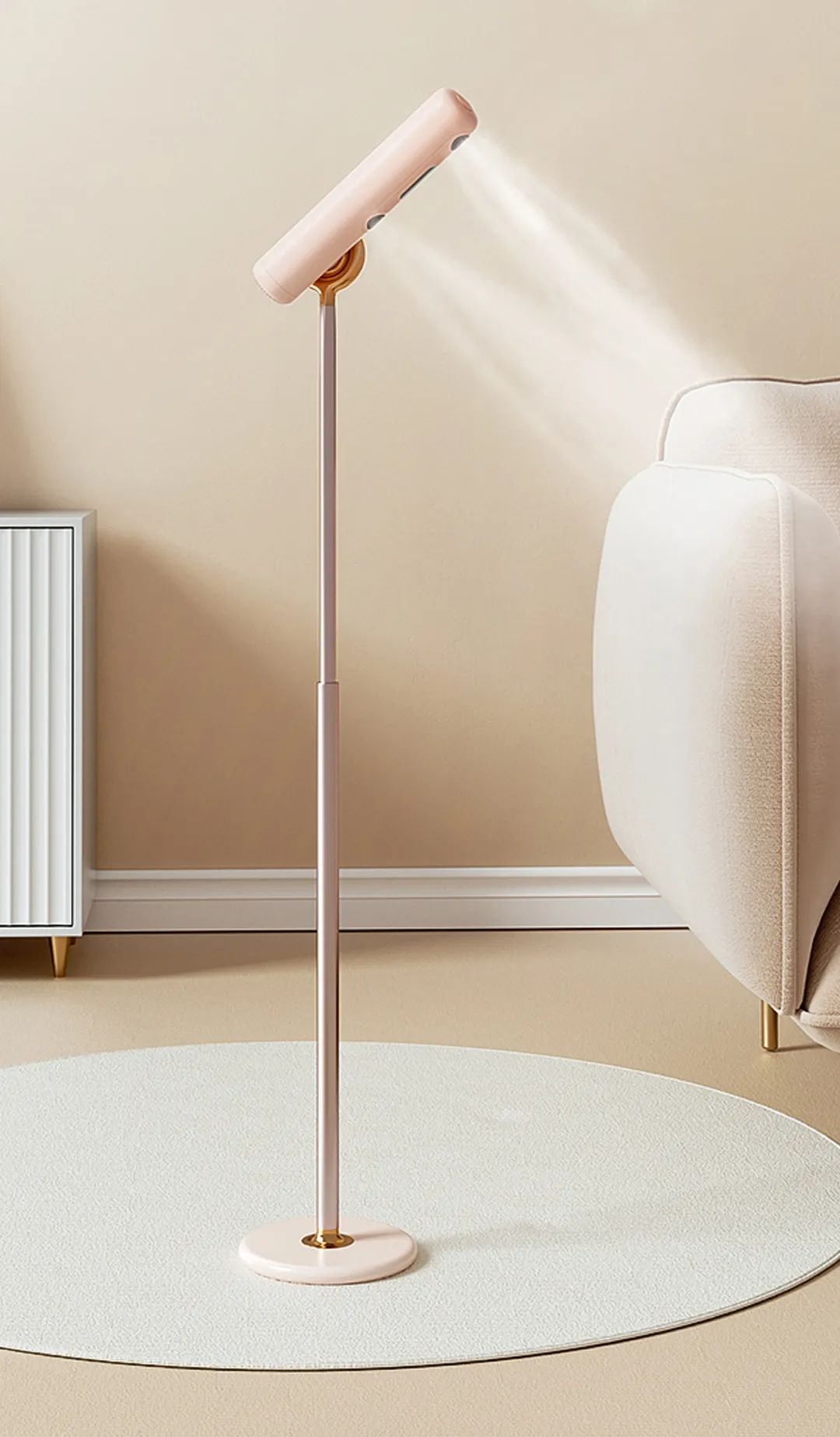 立杆有伸缩设计,实现高度自由调节。风筒可180°旋转,实现角度调控。两者结合,满足多种吹发姿势。