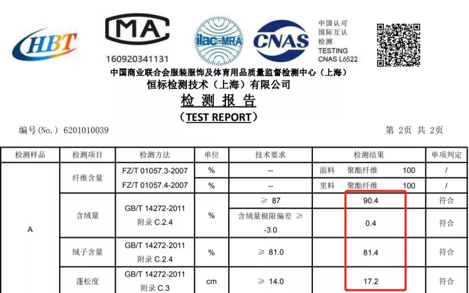 含绒测试达90%以上