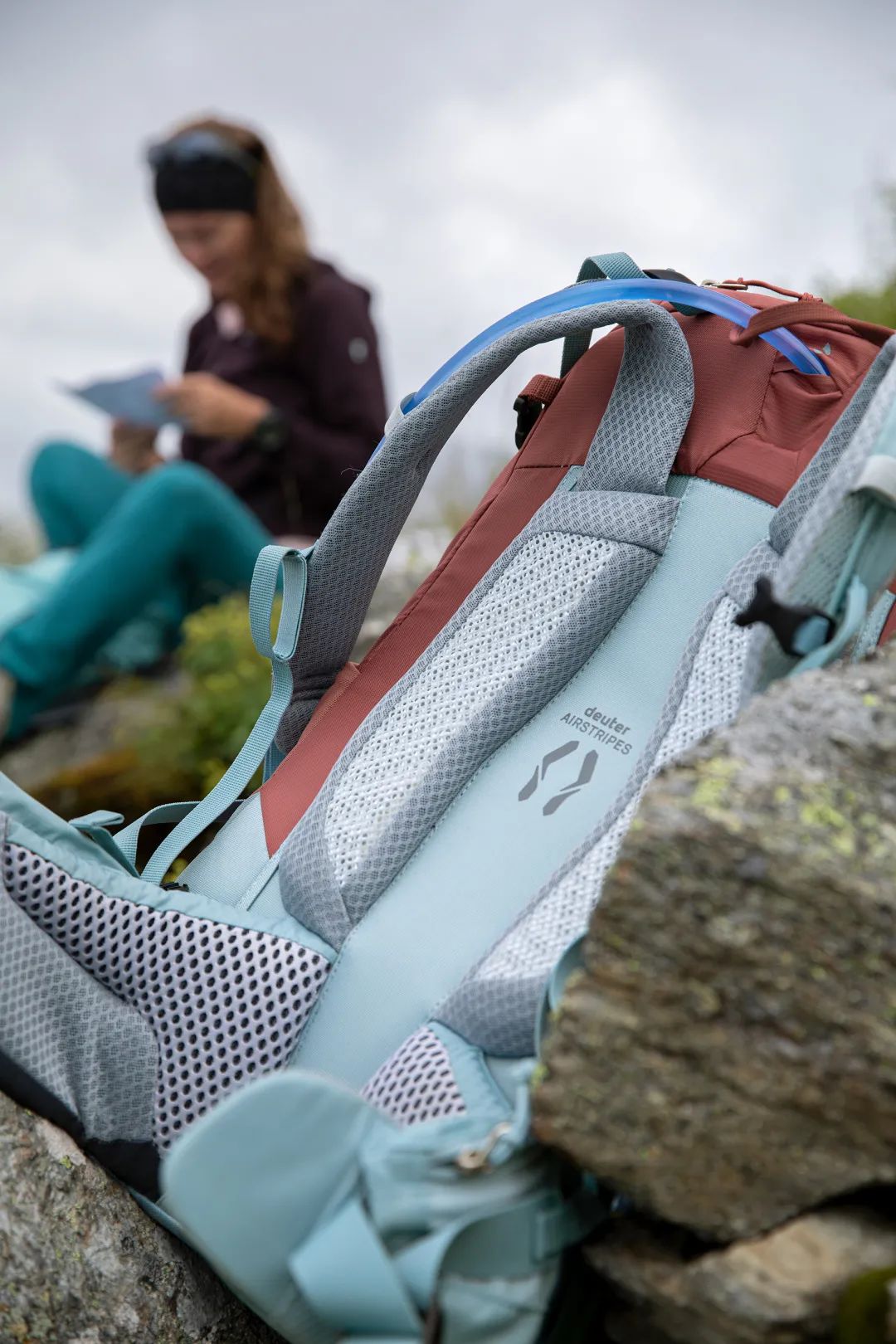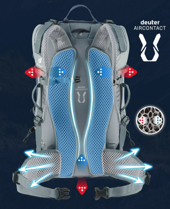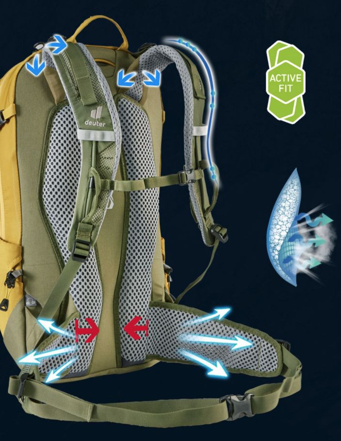 ACTIVEFIT枢转肩带适应不同肩宽,符合人体工程学设计的S形肩带更贴合肩部和颈部的轮廓,宽肩带分散肩部重量减小压力,网状腰翼紧密贴合臀部,徒步的过程可以更加灵活及舒适,负重转移效果更佳。