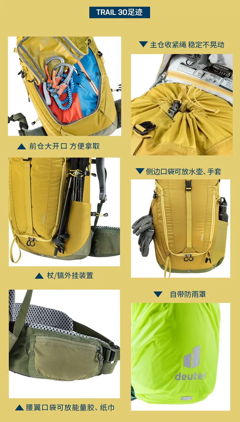 不同点:足迹30L带有顶包,且有两种方式打开,一种是从顶部打开拉绳,一种是前仓U形大开口拉链访问。