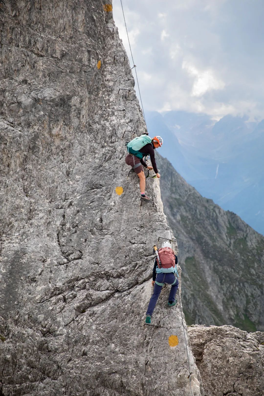 注:飞拉达是意大利文(Via Ferrata,铁道式攀登)的音译,指的是在山体岩壁上建设由钢扶手、脚踏、钢缆等基本保护辅助设施构成的攀登径道,现已被公认为是一项山地活动,并有自己的指南、设备、分级系统和爱好者。