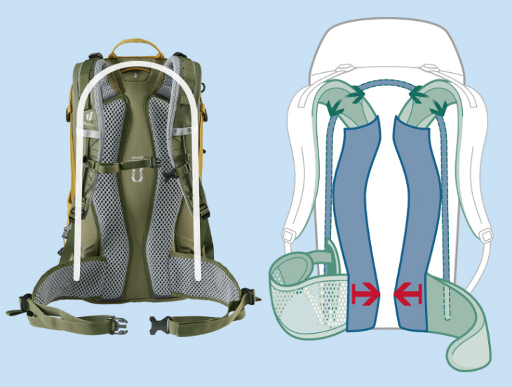 Delrin® U形支撑架可提供良好稳定性,自重轻盈,同时加强负重力,保证背包形状并贴合背部,创造一个舒适而紧凑的背负系统,具有均匀的负重分布和有效的负重转移。