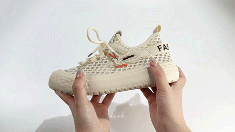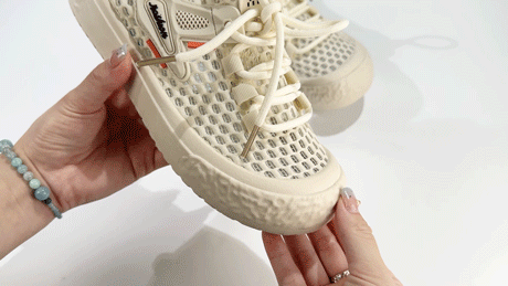 凑近看鞋面,细密纱线交错出上千个“微型透气孔”。