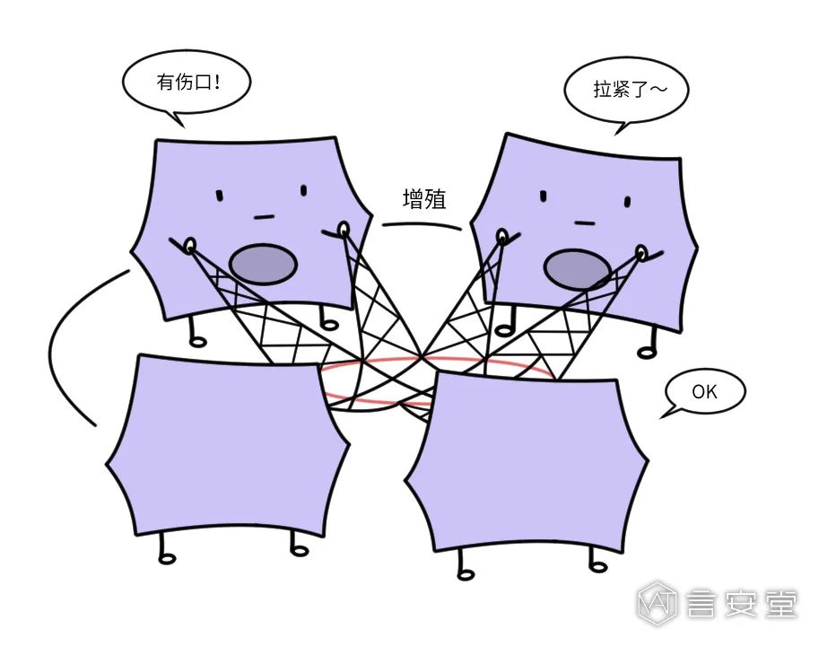 在真皮层有成纤维细胞,在健康组织中细胞与细胞外基质(细胞外基质则包括大家熟悉的胶原蛋白、弹性蛋白、纤连蛋白、多糖等)成分相连当,当组织损害时,修复过程的第一步释放蛋白酶使细胞与细胞外基质分离,细胞迁移到受损点引发修复过程。