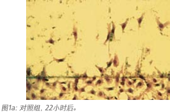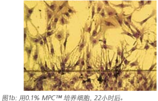实验是成纤维细胞接种在培养基的一边上面,培养基人为“挖坑”。如上图从成纤维细胞的汇合细胞层中刮去一定面积(横线)。加入 MPC™(乳清蛋白) 后,细胞开始迅速迁移,其速度取决于浓度。而未添加 MPC™(乳清蛋白),未活化的成纤维细胞很少发生迁移,则几乎没有观察到细胞迁移现象。