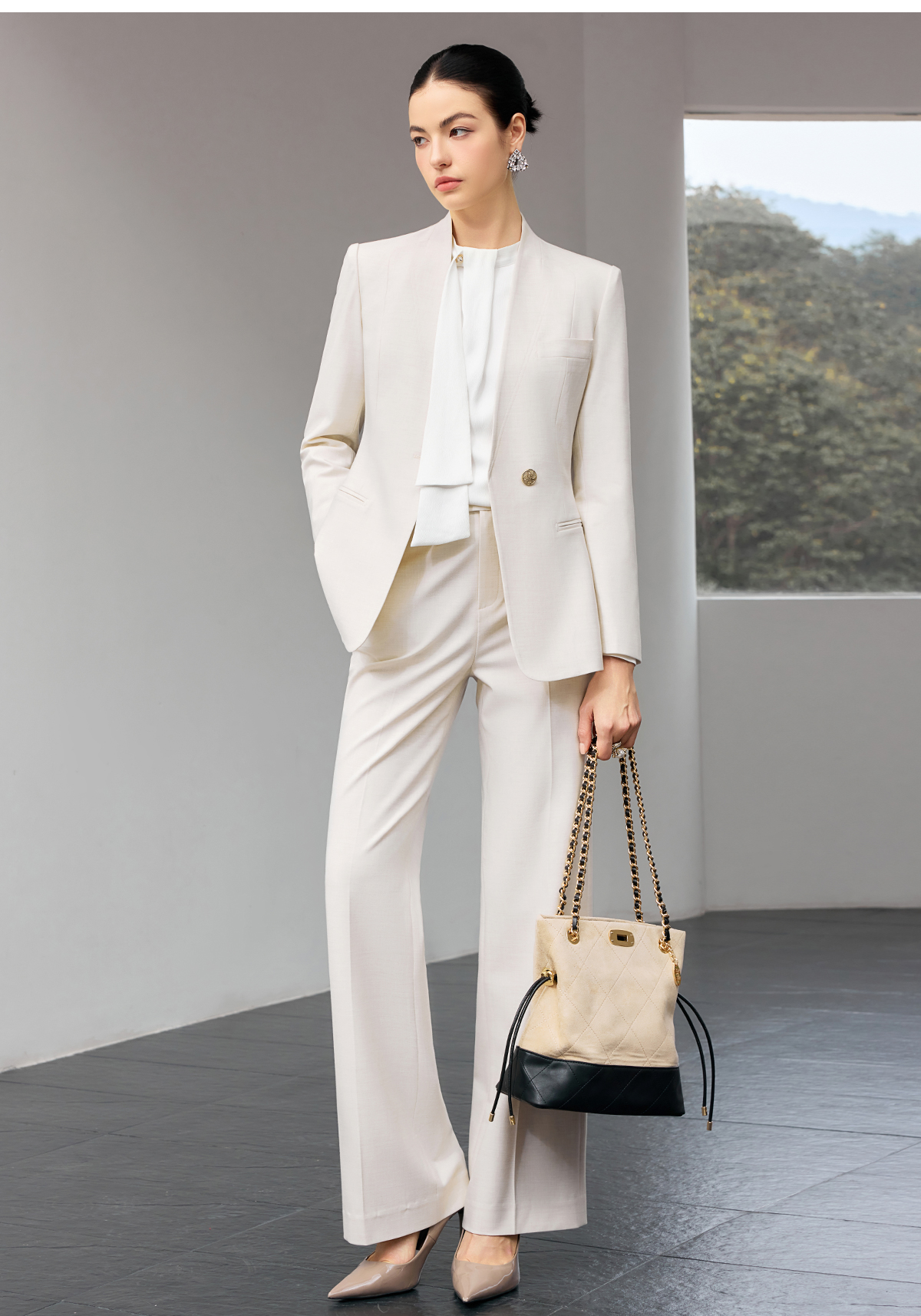 雾白竖纹,解锁职场穿搭的高阶质感。