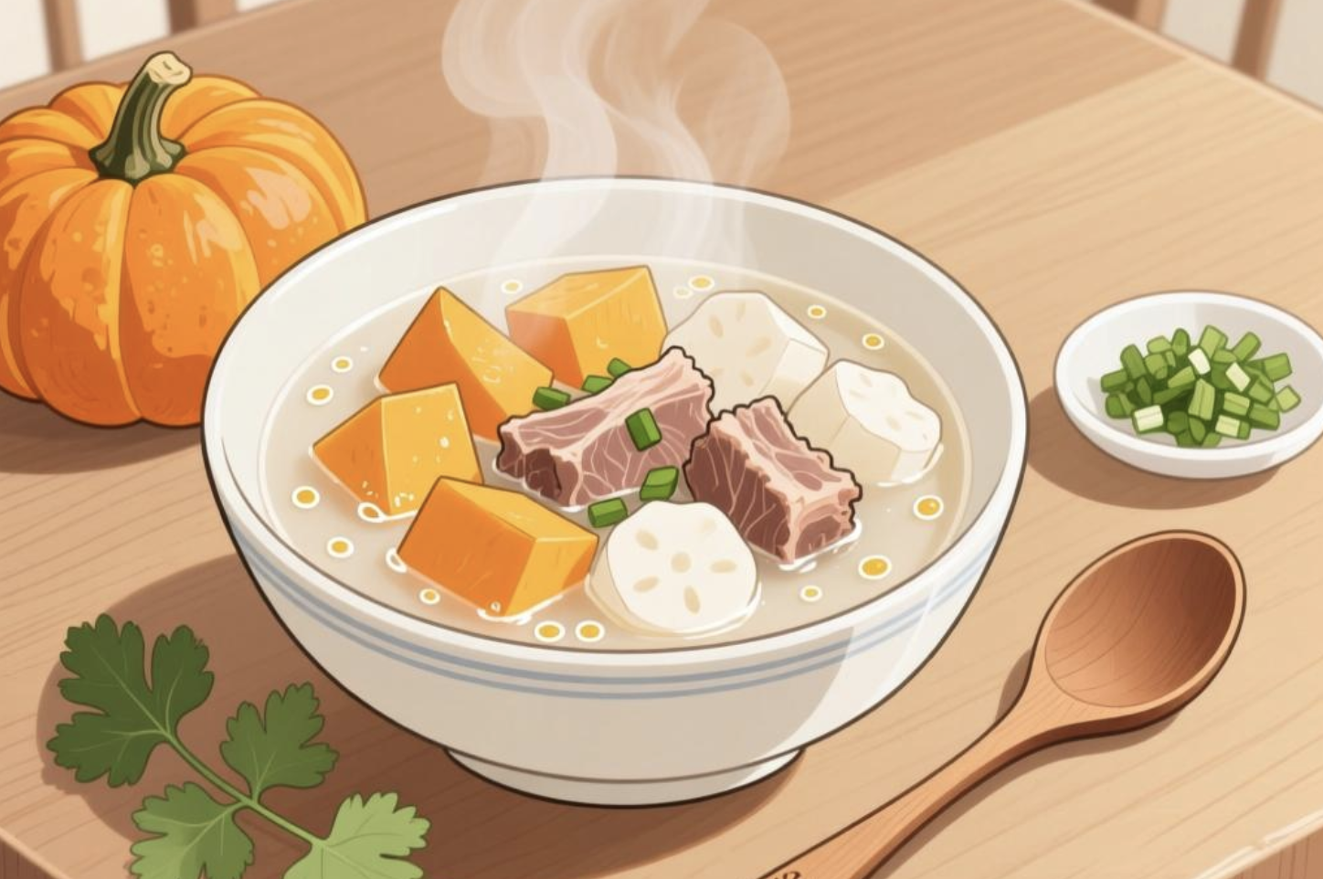 护胃原理:南瓜富含果胶保护胃壁,山药与排骨提供优质蛋白。