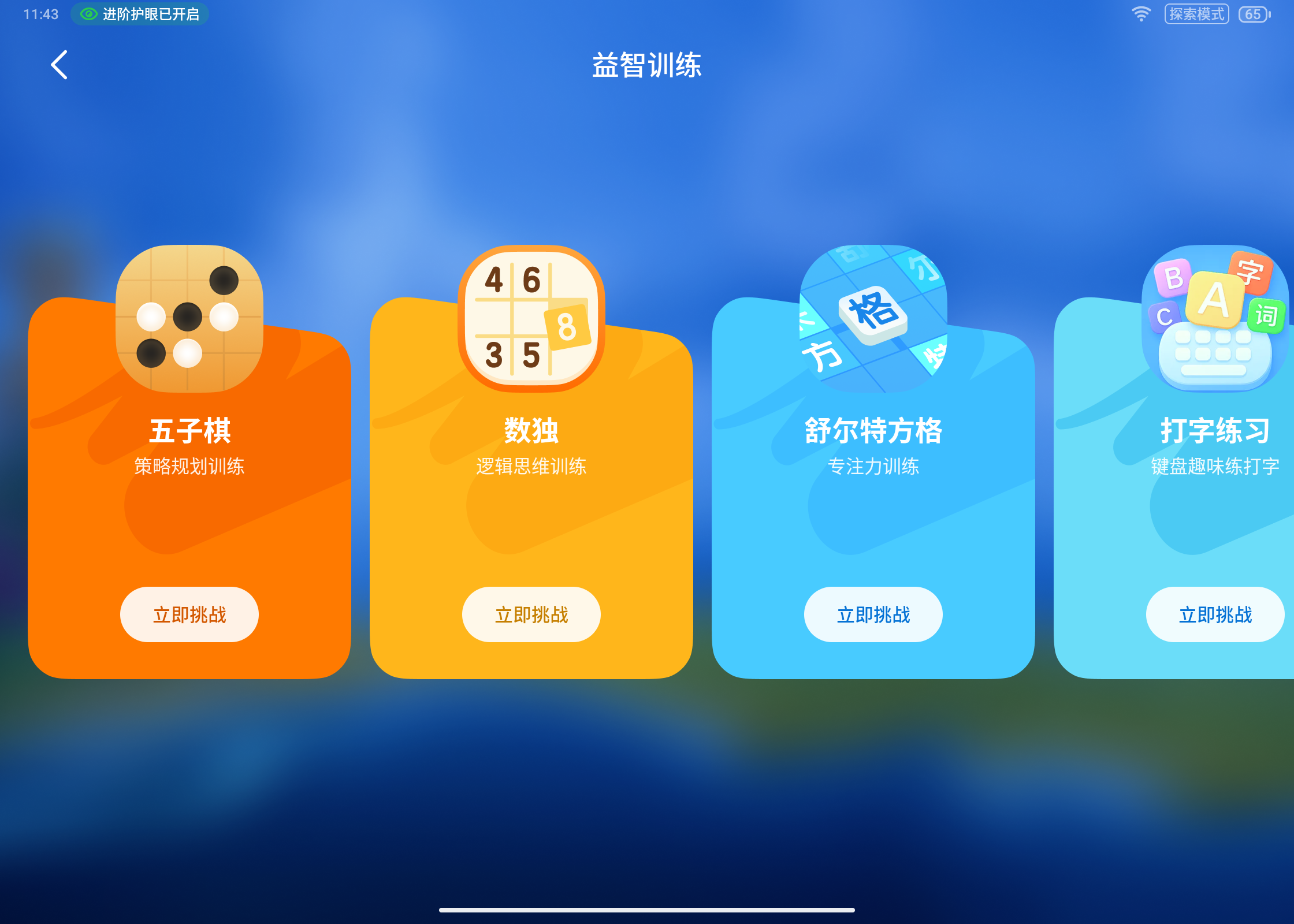益智训练版块主要是内置了五子棋、数独、舒尔特方格、打字练习(需配合键盘使用)这几款小益智游戏,让孩子休闲娱乐的时候玩一玩,既有趣还能培养一下思维能力和专注力。