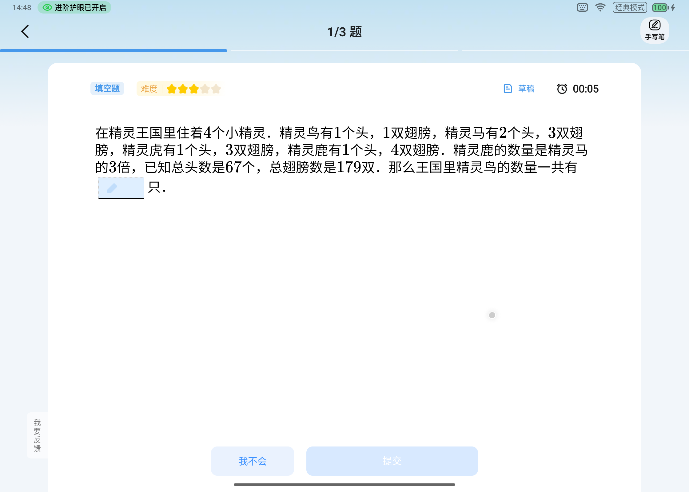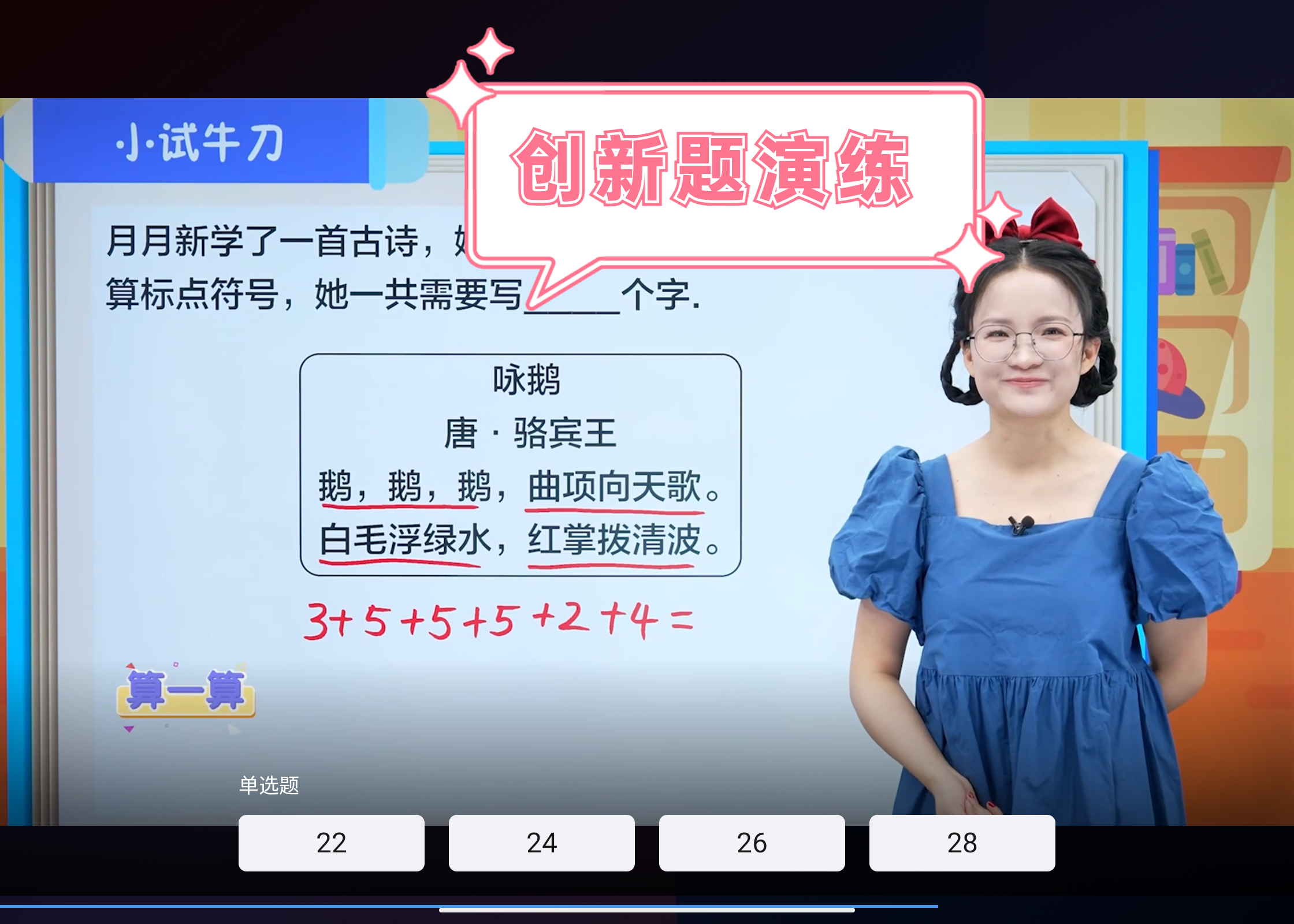 在小试牛刀环节,老师会针对跨学科知识综合 情境下的加减法应用问题设计专项练习,通过引入古诗、新情景化故事等,让学生在实际操作中巩固所学,加深对知识的理解,同时检验学生对新考法的掌握程度。