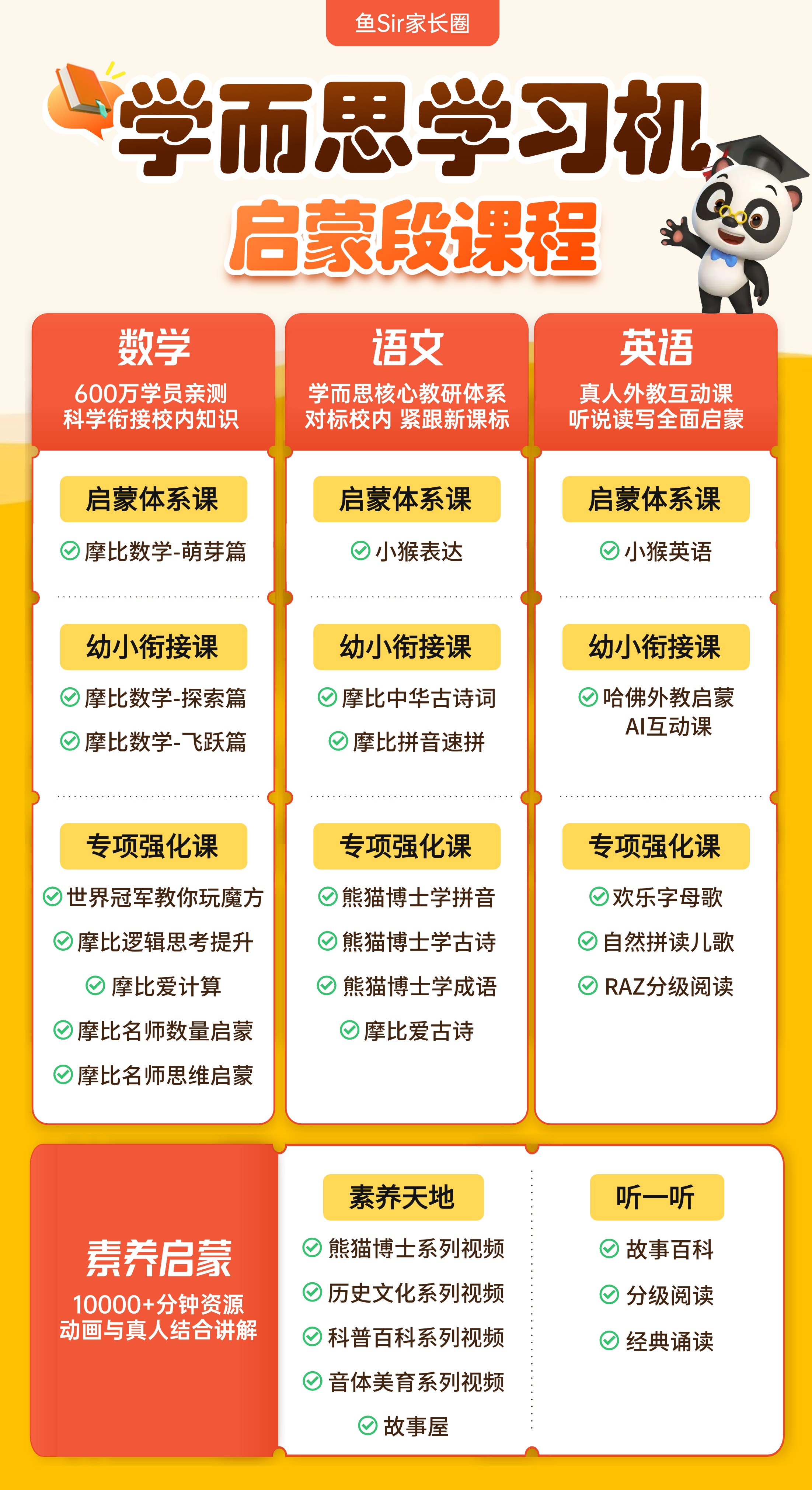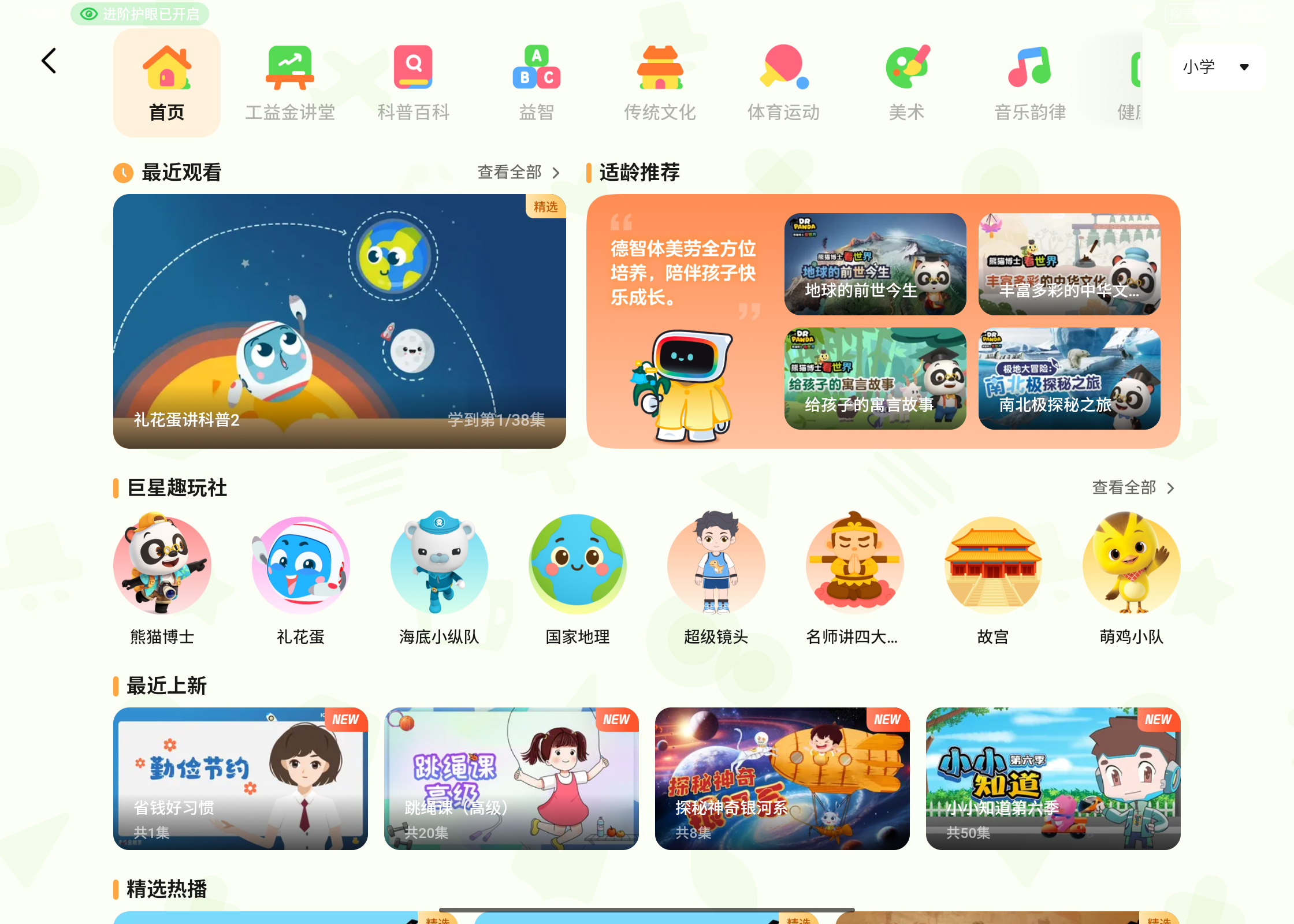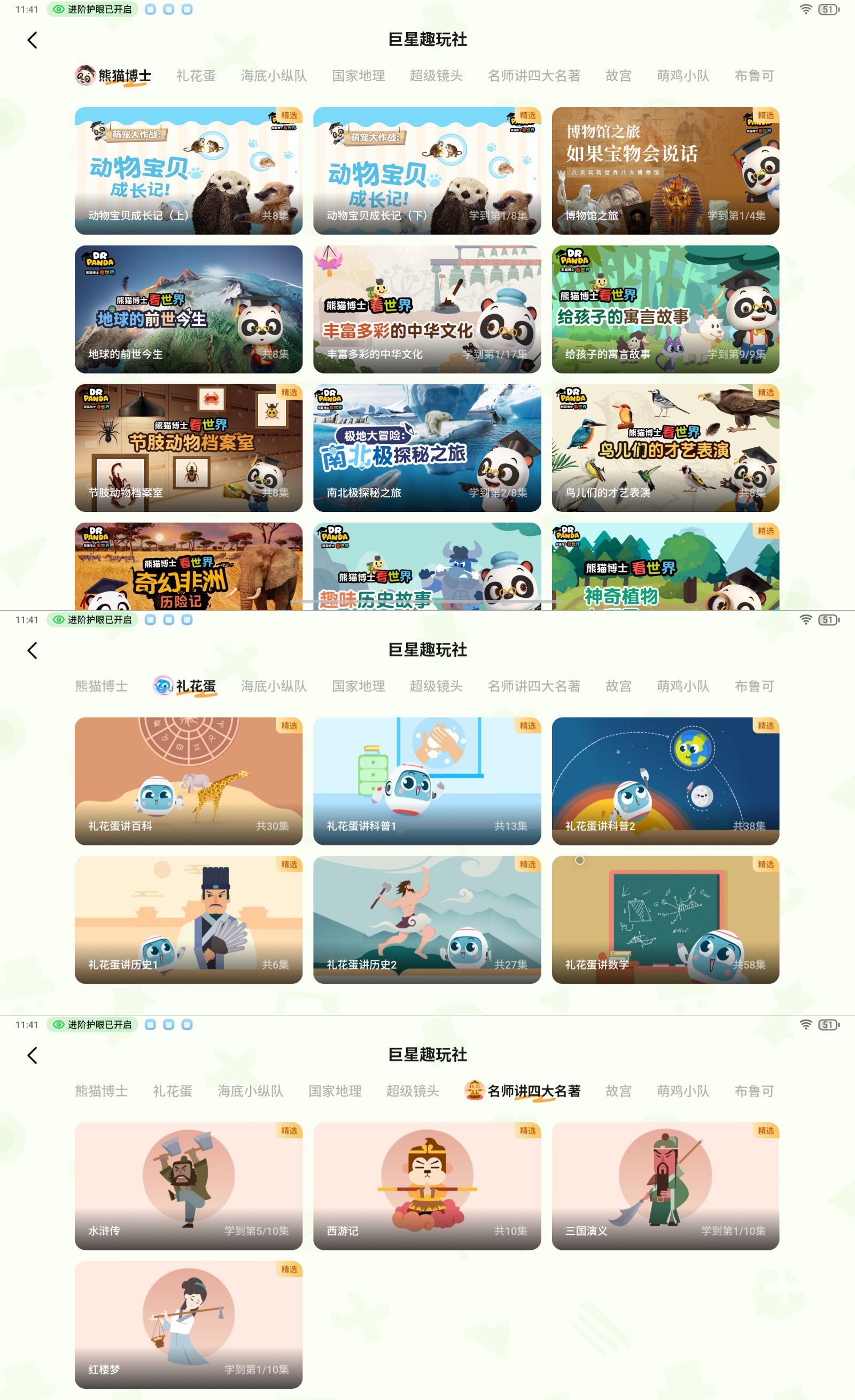 🎬独家自制内容:深受孩子们喜欢的熊猫博士、礼花蛋数学&科普百科&历史、名师讲解四大名著及国学经典