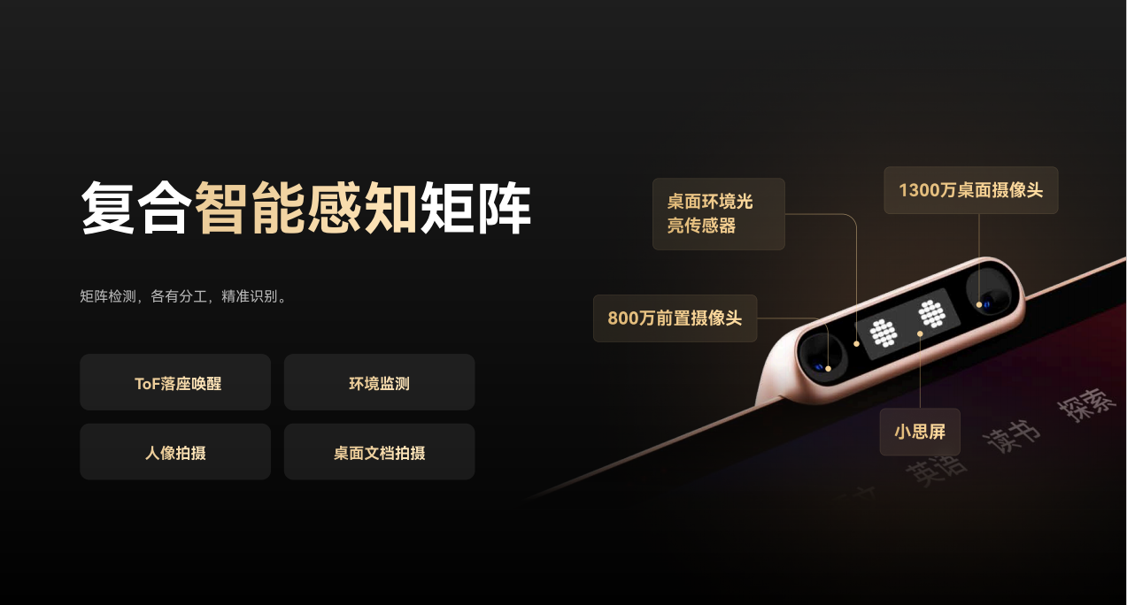 新款T4 pro,一体化小思智慧岛取代了原来的智慧眼,同时搭载了两个摄像头,一个800万的前置摄像头,用来监测坐姿,捕捉屏幕前方孩子的情绪状态,另一个1300万的桌面摄像头,可以更加精准地识别孩子桌面的学习情况(课本/作业/教辅)。