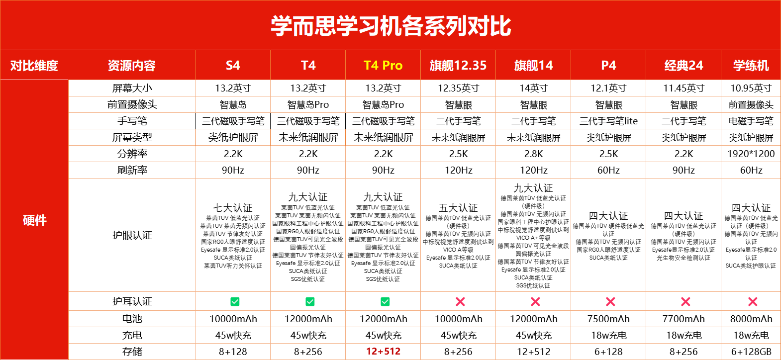 说实话现在学习机硬件技术迭代不快,却年年推新款,有预算的话还是比较建议把“换新周期”拉长,买就一步到位,直接上学而思 T4 Pro,是现在学而思家族里资源最全、功能最顶的机皇,让娃也体验一下类似妈妈们买奢侈品的爽感!