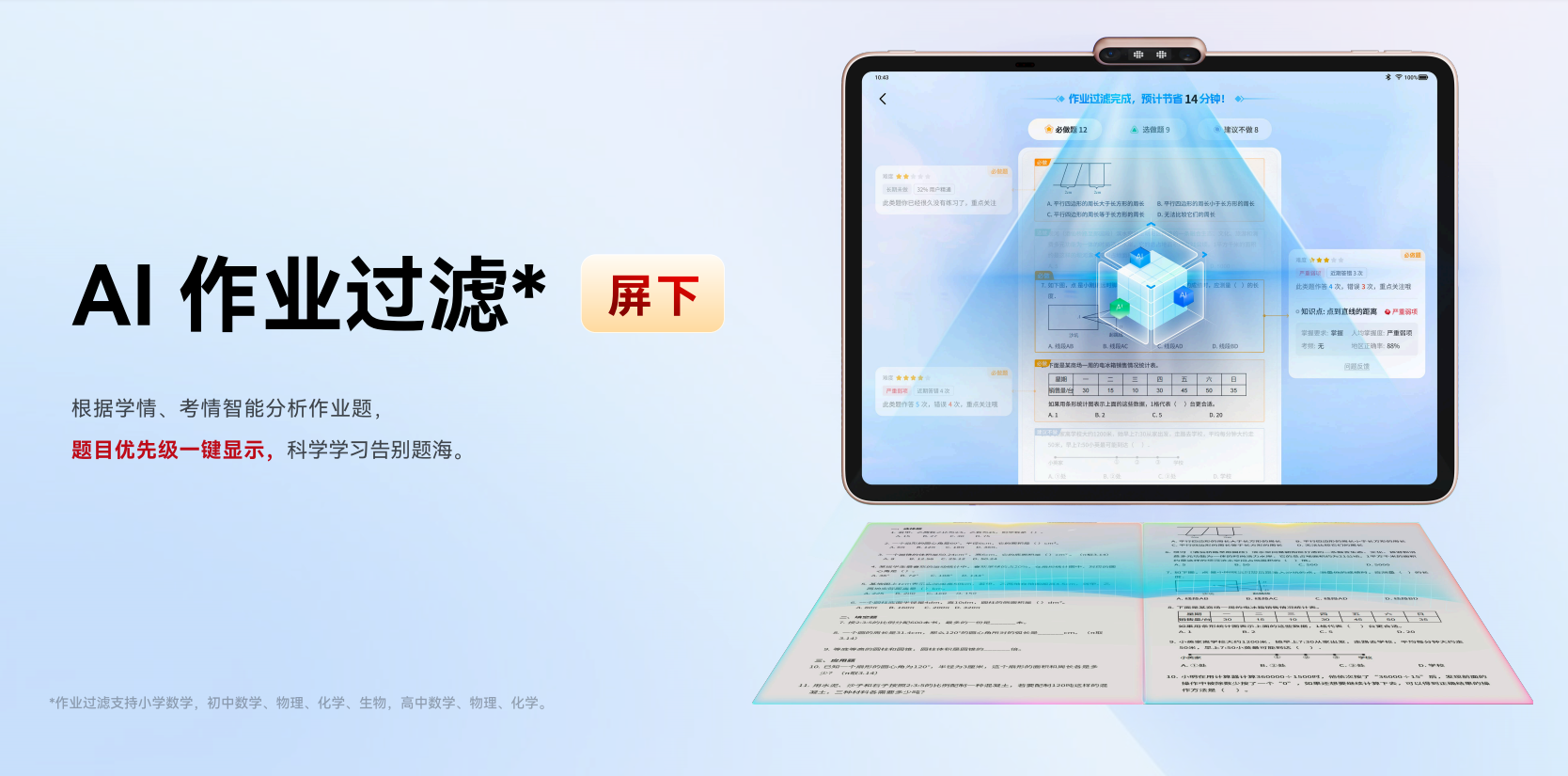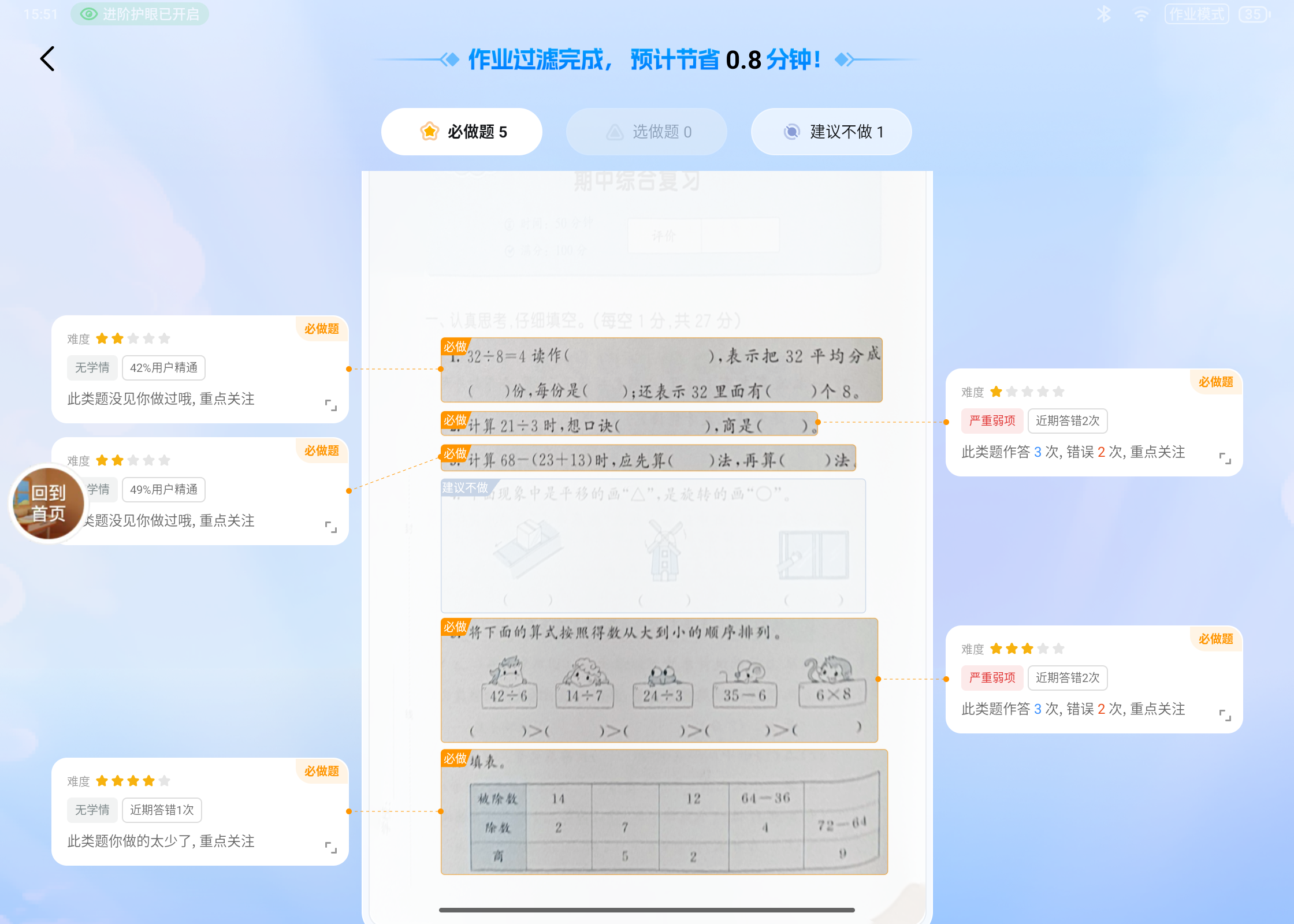 还可以通过作业过滤功能,只要将纸质作业放在智慧岛下,一键作业扫描,几秒钟就能将所有题目标记优先级,没做过的或者掌握不牢的,标记为必做题,需要重点关注,已经掌握的则标记为建议不做,就可以直接过滤掉了。
