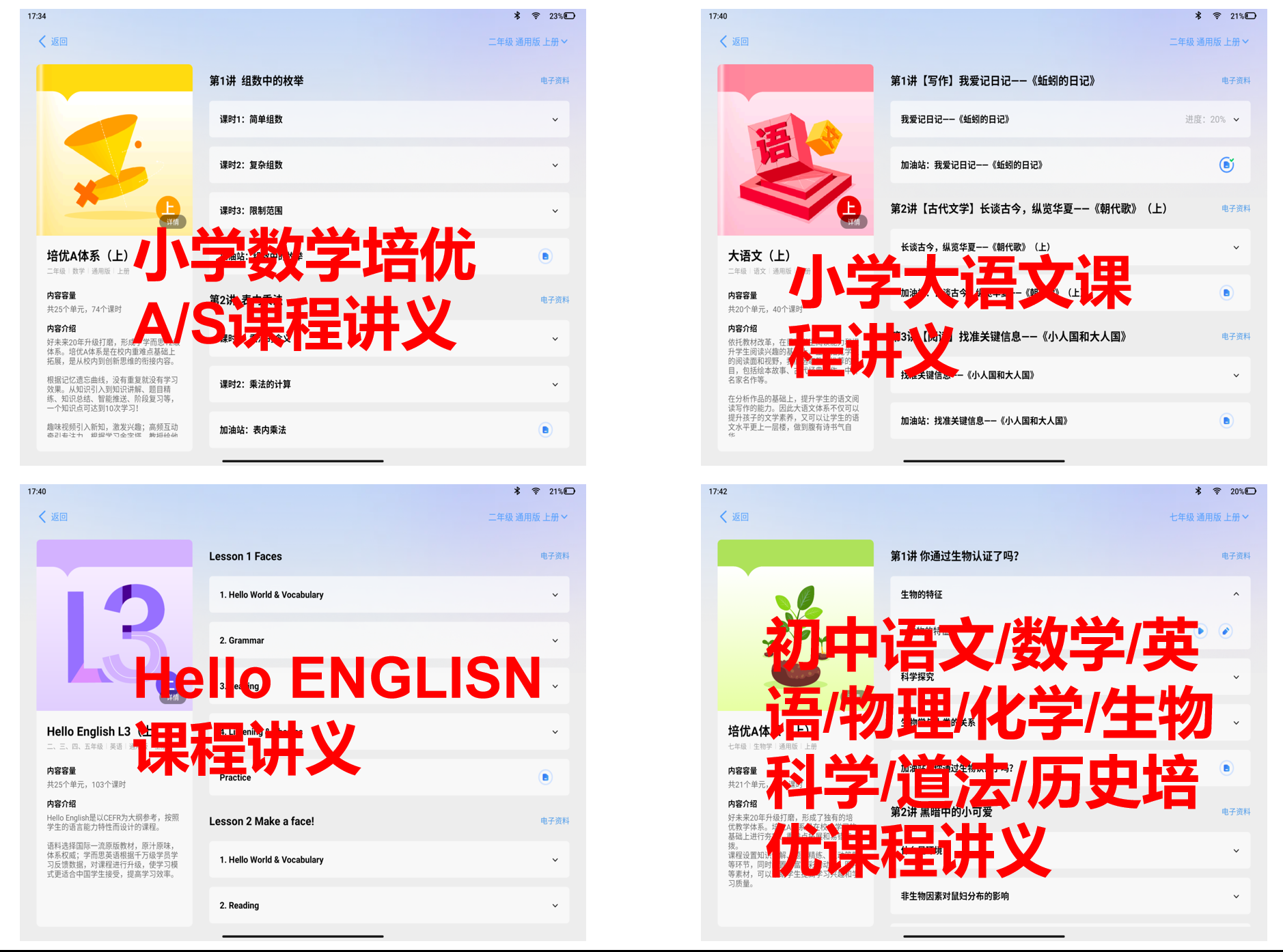 牛娃就更不用担心了,学而思最有价值的培优体系课,也是全学科全学段任意学,大语文培优,经典数学培优A/S,剑桥原版体系Hello English和新概念语法词汇专项课,初中理科实验,初高全科培优课等等