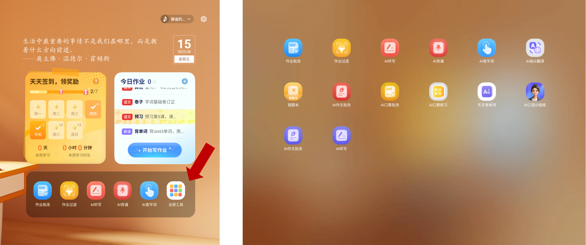 打开学习机,首页可以直达小思工作坊,当然也可以支持唤醒小思以后语音进入