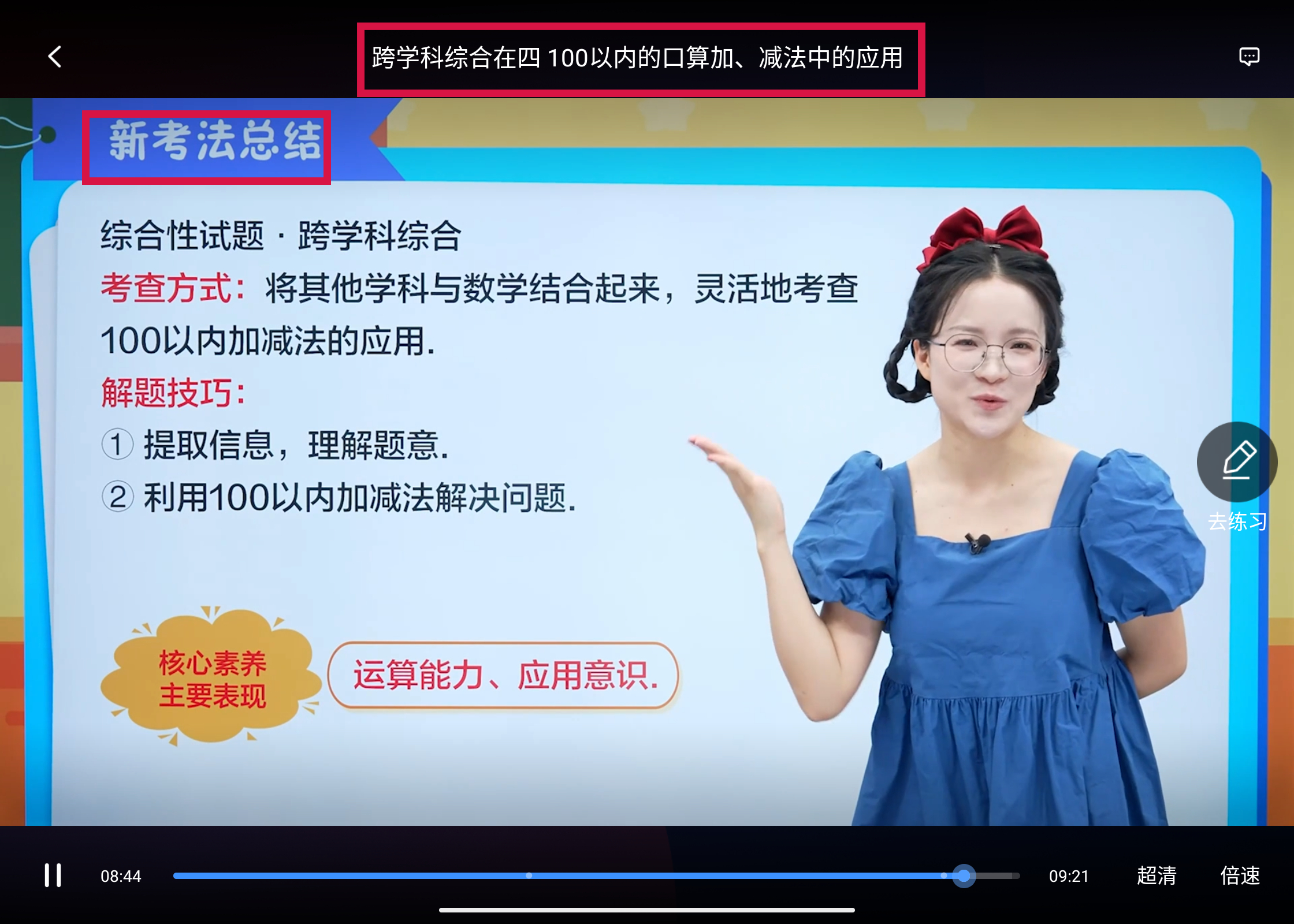 在练习环节,系统会围绕本节重点给出多样化的练习题,让学生在不同情境中灵活运用所学知识,进一步提升学生运用 100 以内加减法解决实际问题的能力,强化学生对新考法的理解与掌握。