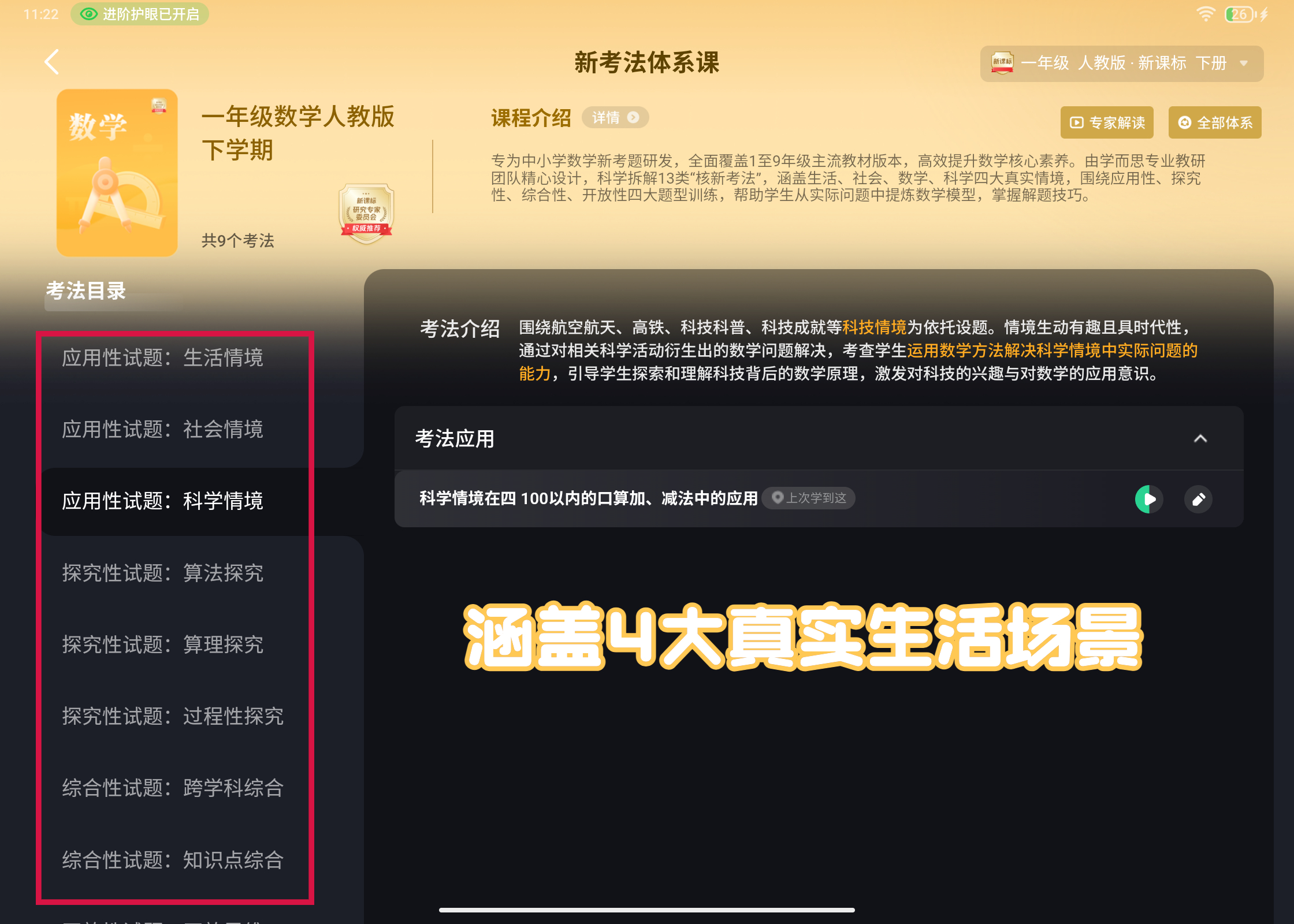 学而思的新考法体系课,按照生活情境、社会情境、科学情境、算理探究、跨学科综合、知识点综合等小情境,对校内知识点和新课标新题型进行了深入拆分,每一种小情境下课程设置、例题题型、学习重点都不同。