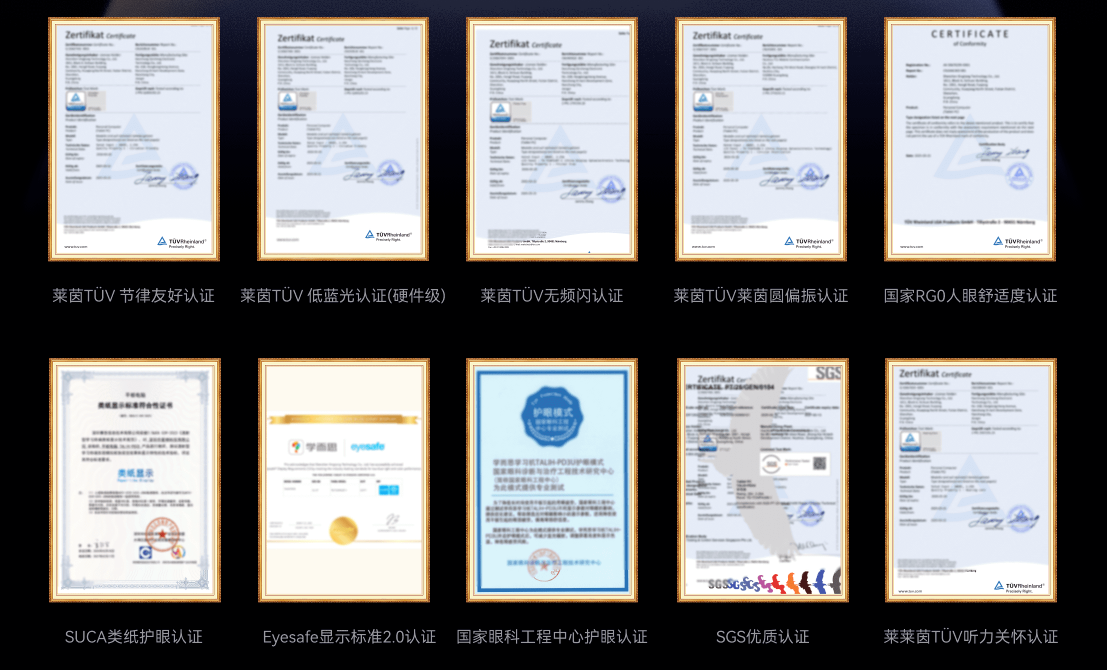 权威认证全:一口气拿下 9 大护眼认证和听力关怀认证,是目前认证最全的学习机之一