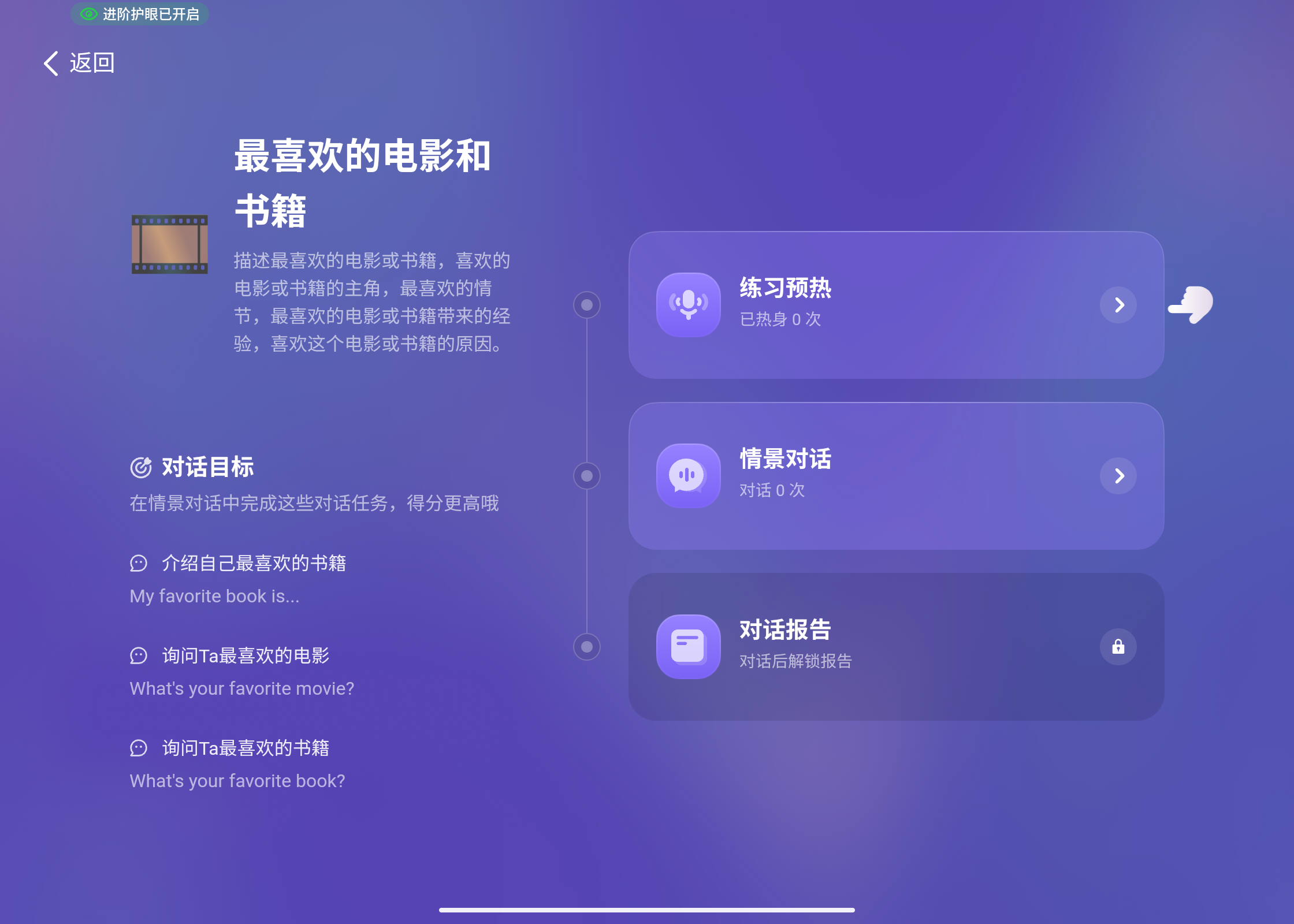 练-情景对话,是通过沉浸式多轮对话,根据孩子的开口能力,自适应引导对话,增强互动性,从而加强孩子张嘴读的自信心。如果遇到自己回答不了的,可以点击底部的“提示”,或者直接说“I don't know",甚至说中文也是继续对话的。