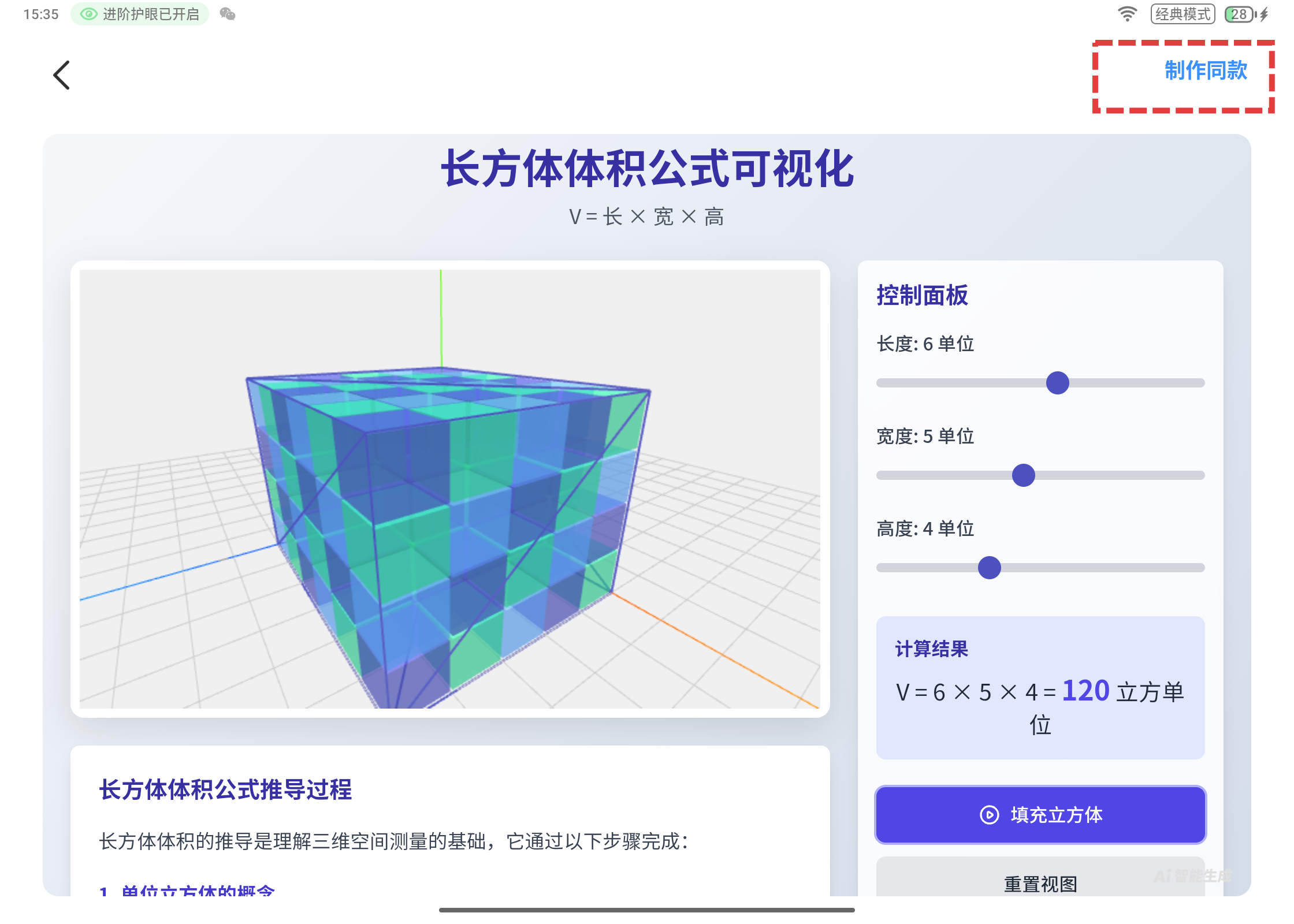通过滑动长度、宽度、高度的滑块,孩子可以主动改变长方体的尺寸,同步看到长方体的形状实时缩放(如拉长“长度”时,底面一行的小立方体数量增加),计算结果(体积)随参数变化而动态更新(如长×宽不变时,高度越高,体积越大)。
