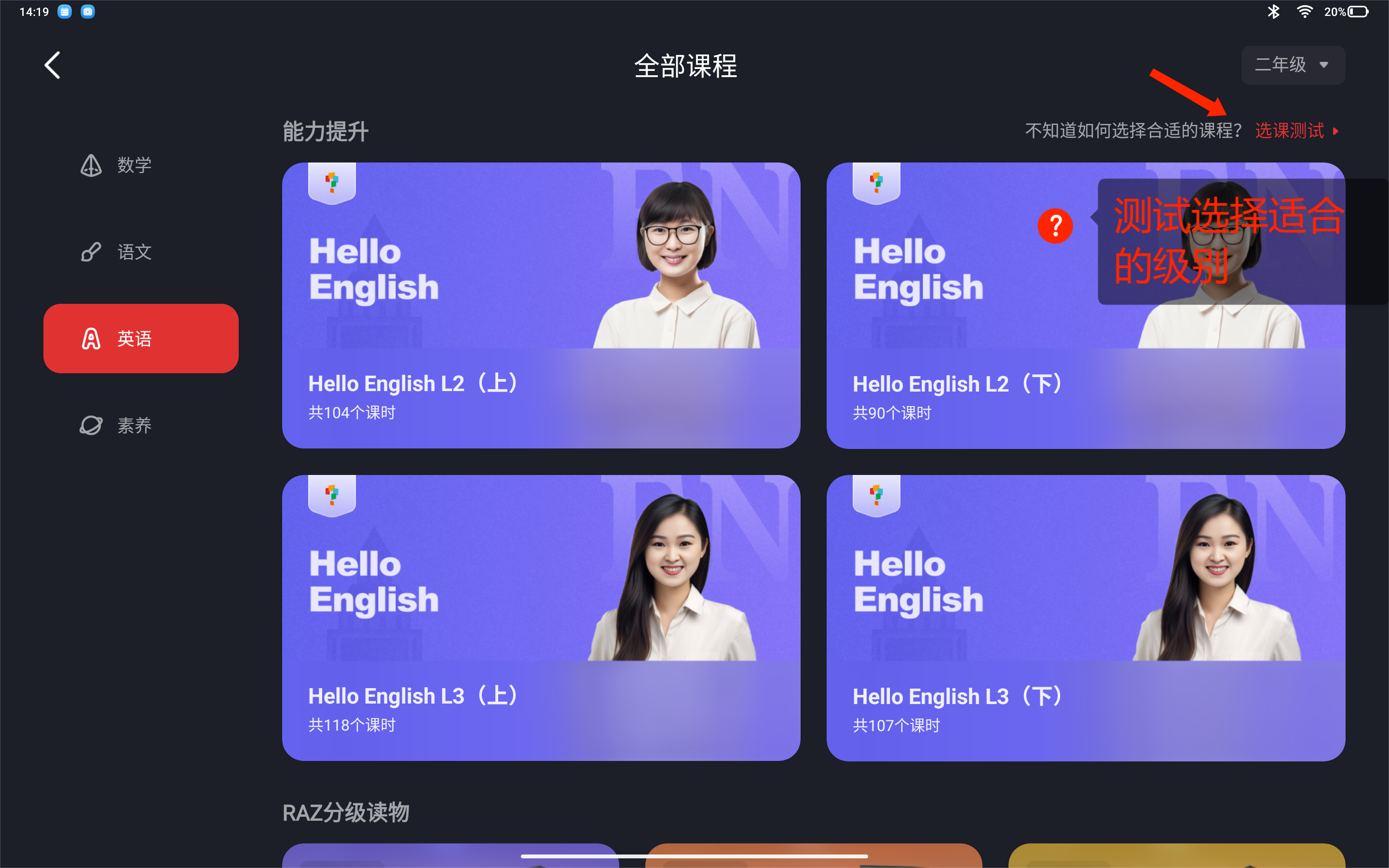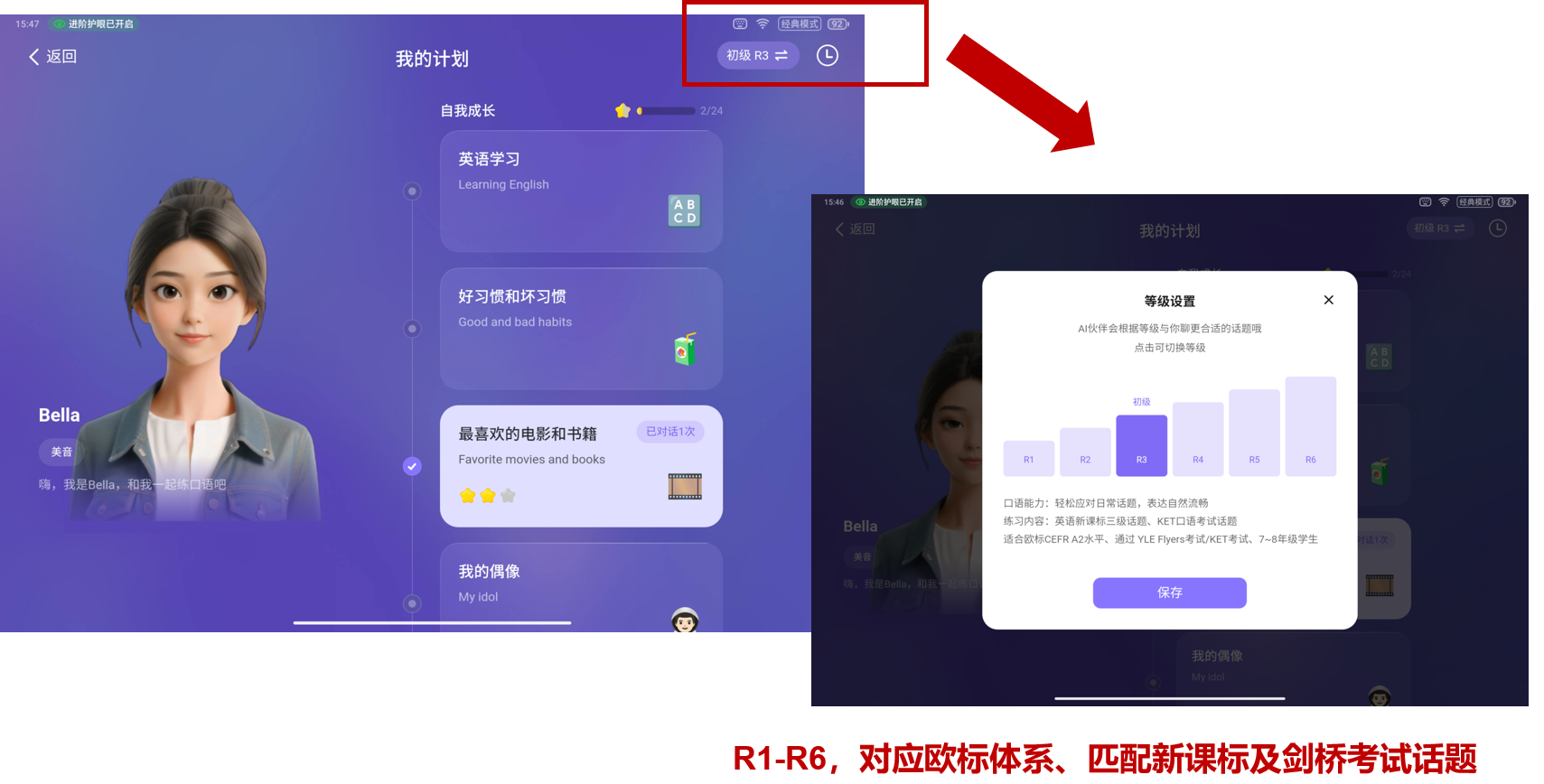 第一步,点击进入以后,右上角选择级别,从R1到R6,一共有6个等级,从最开始R1对标小学一年级水平到R3对标KET水平,再到高阶R6 FCE也就是高中以上的水平全面覆盖