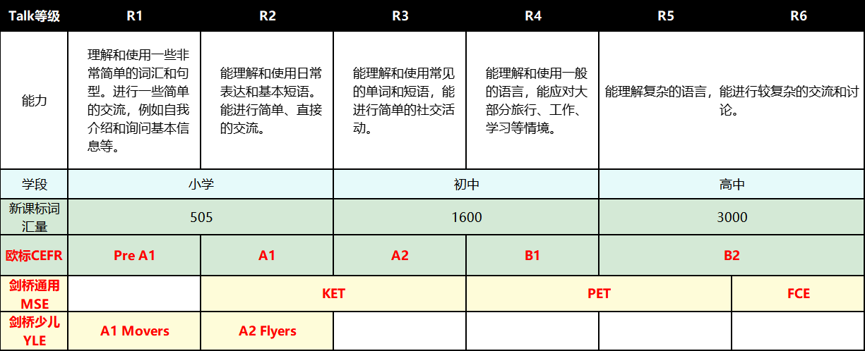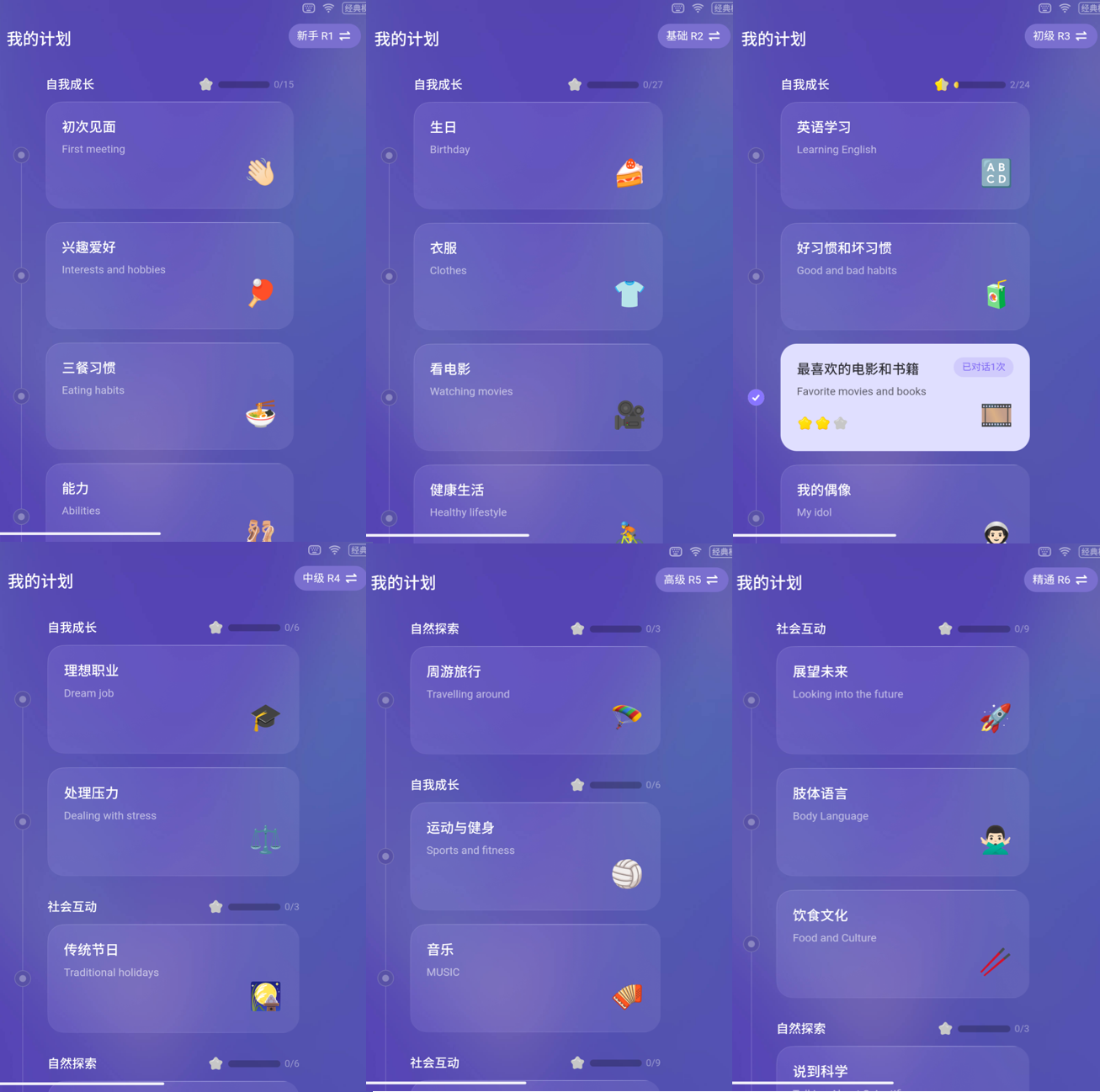 每个级别对应的话题难度也是逐级增加的,R1级别聊的是“初次见面”“兴趣爱好”“三餐习惯”等简单的话题,R3 KET水平就聊“英语学习”“习惯”“电影书籍”“偶像名人”,到R6就到了“展望未来”“肢体语言”“饮食文化”等社会自然科学中比较深入的话题了。