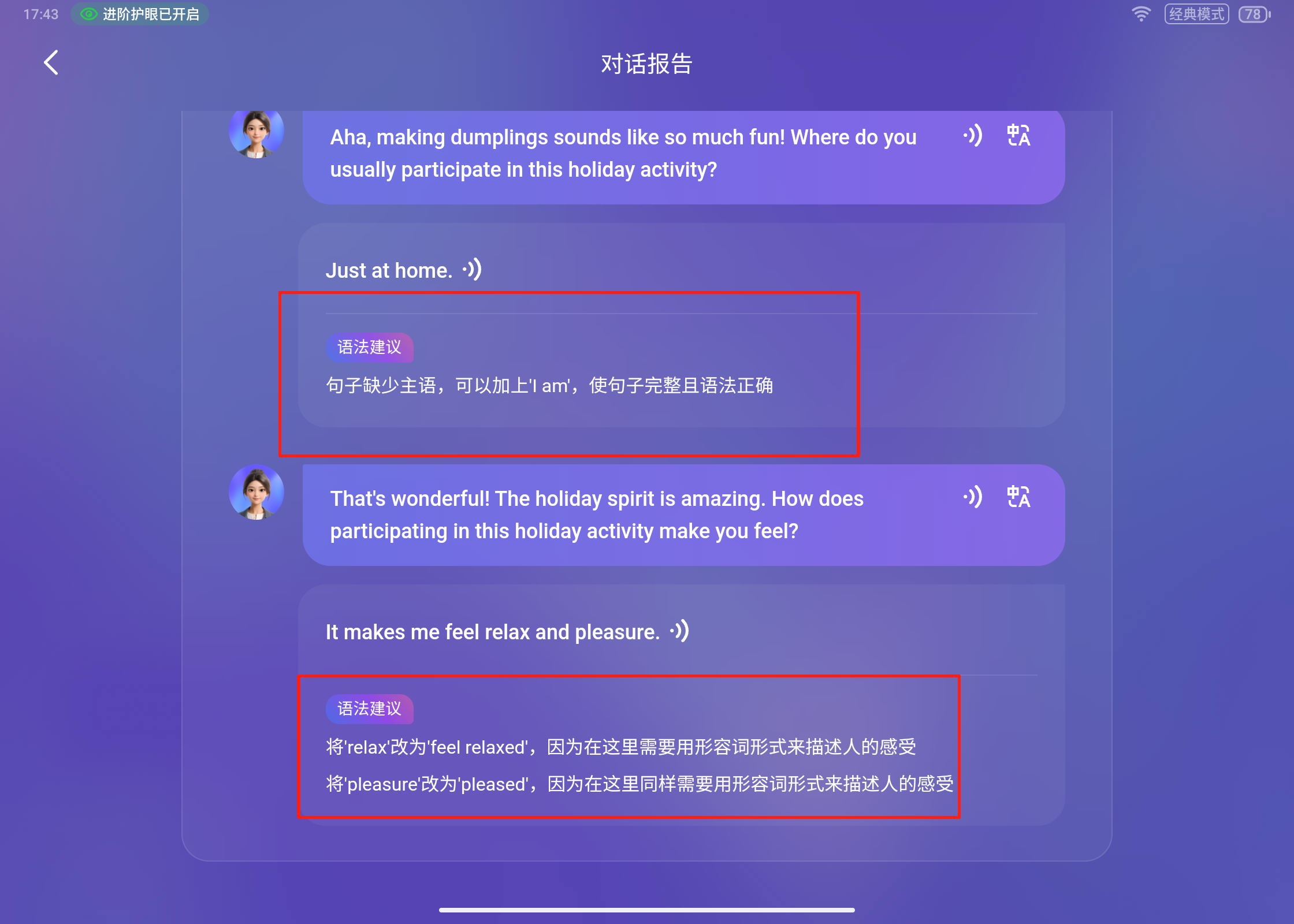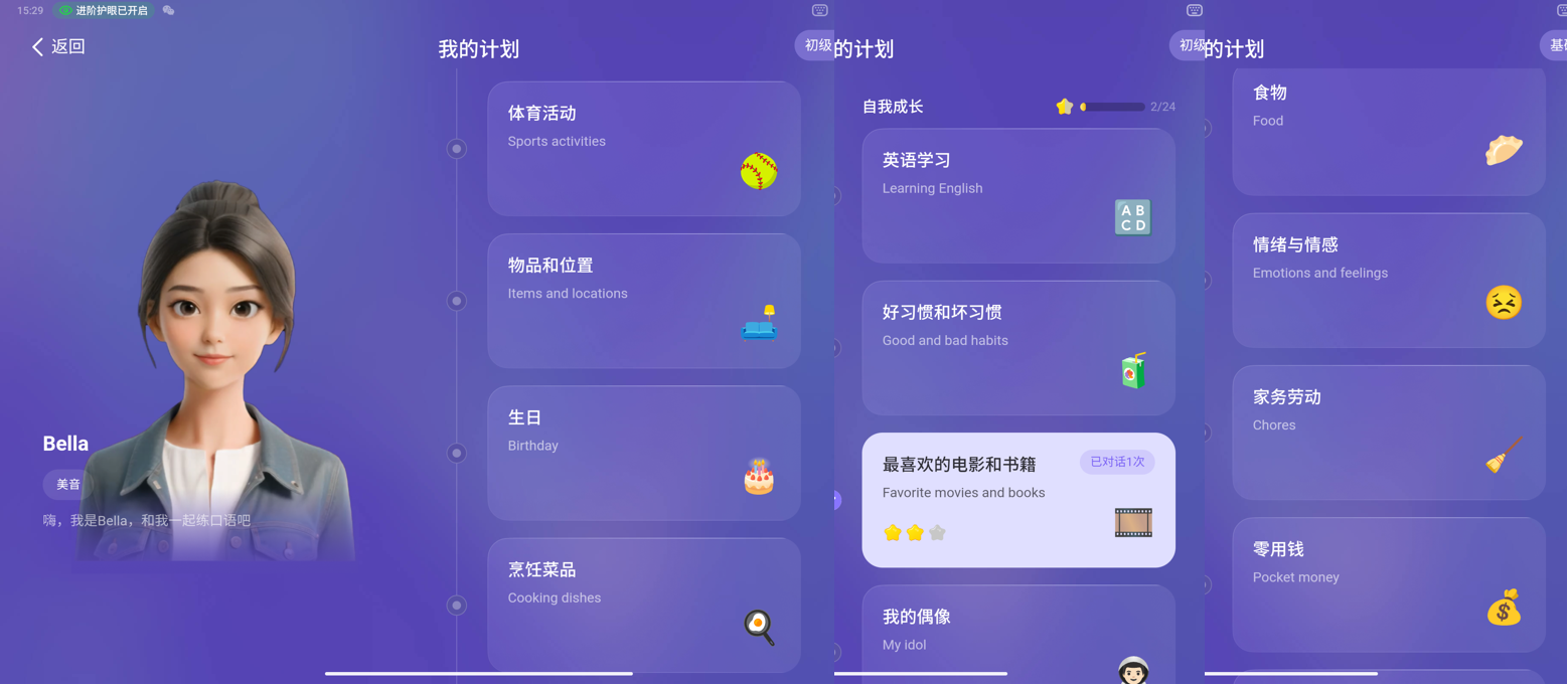 评-对话报告指的是,机器会根据孩子上面的情况,给出详细的点评,语法和发音都会进行详细的纠错。既能找到高光时刻,增强信心,又能找到薄弱环节,加强学习。