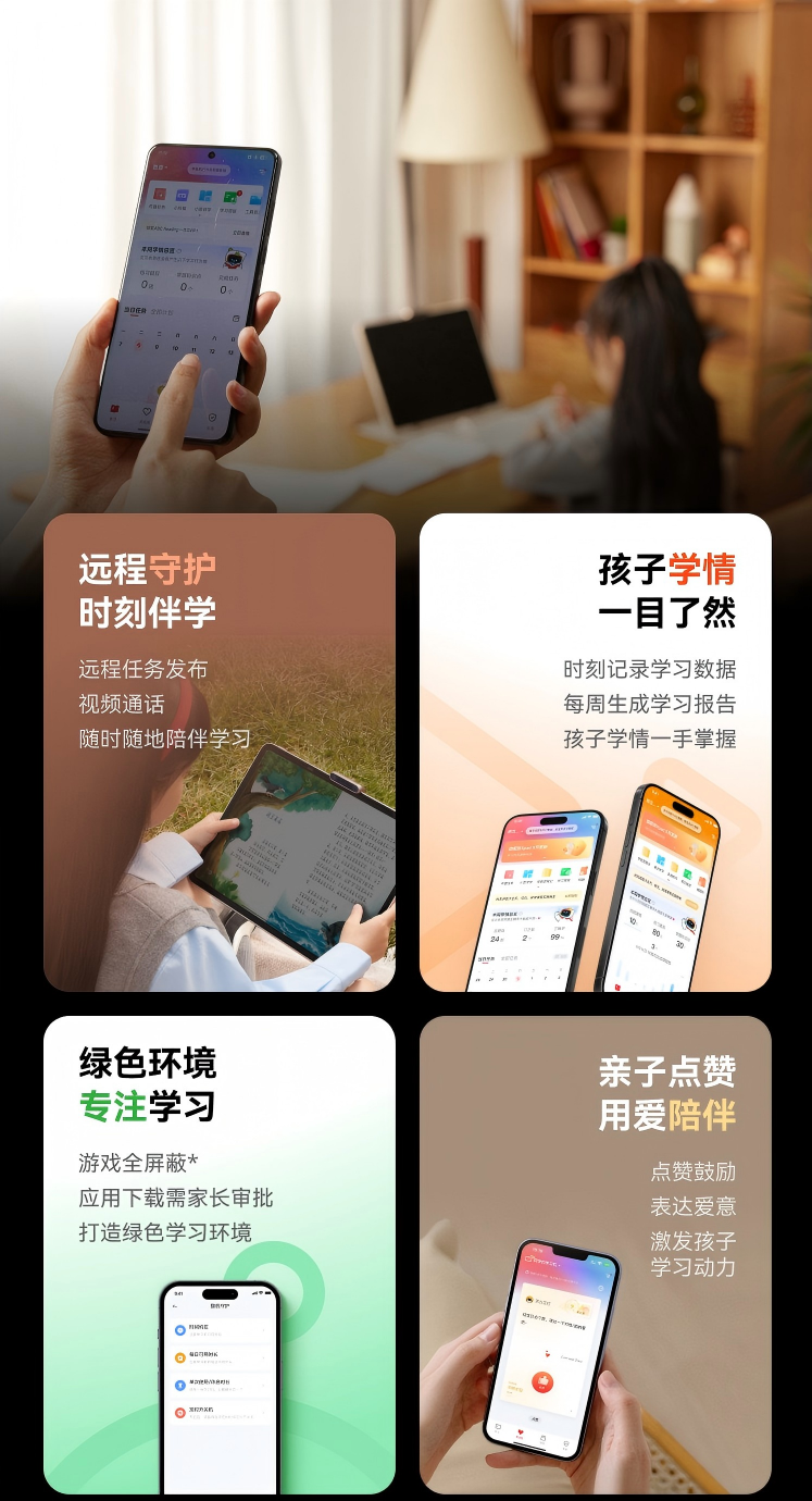 软件:更像是一位“24 小时护眼管家”,会按家长端设定的护眼参数、时长限制和应用管控,牢牢地守护学习机的绿色环境,到时间自动锁定,提醒休息,让孩子在合适的时间、合适的光线下,只专注学习,真正做到软硬联手、全天守护。