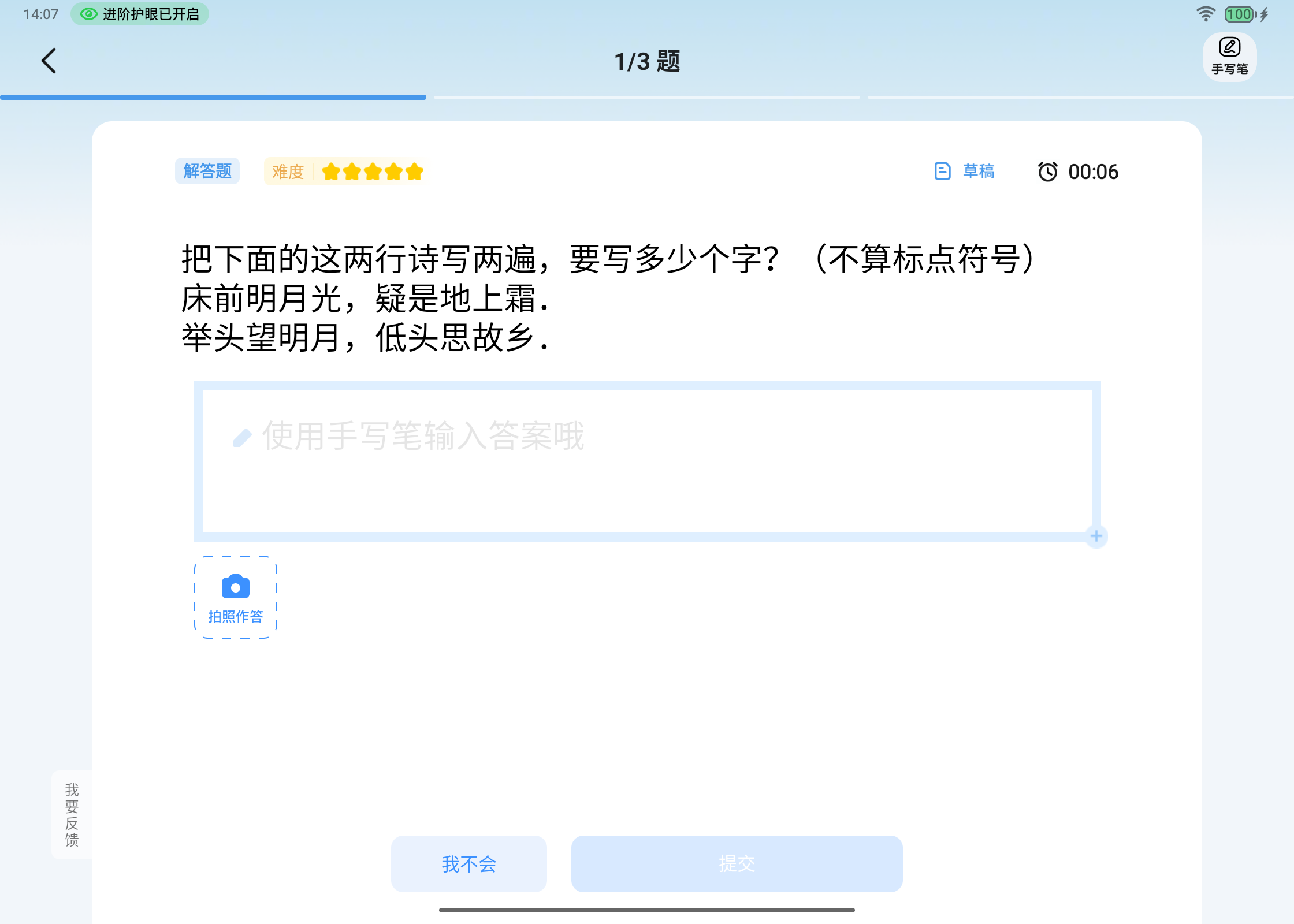点击开始作业,默认打开番茄钟计时:默认 25 min 专注+5 min 休息,倒计时条在屏幕顶端常亮,降低走神概率。