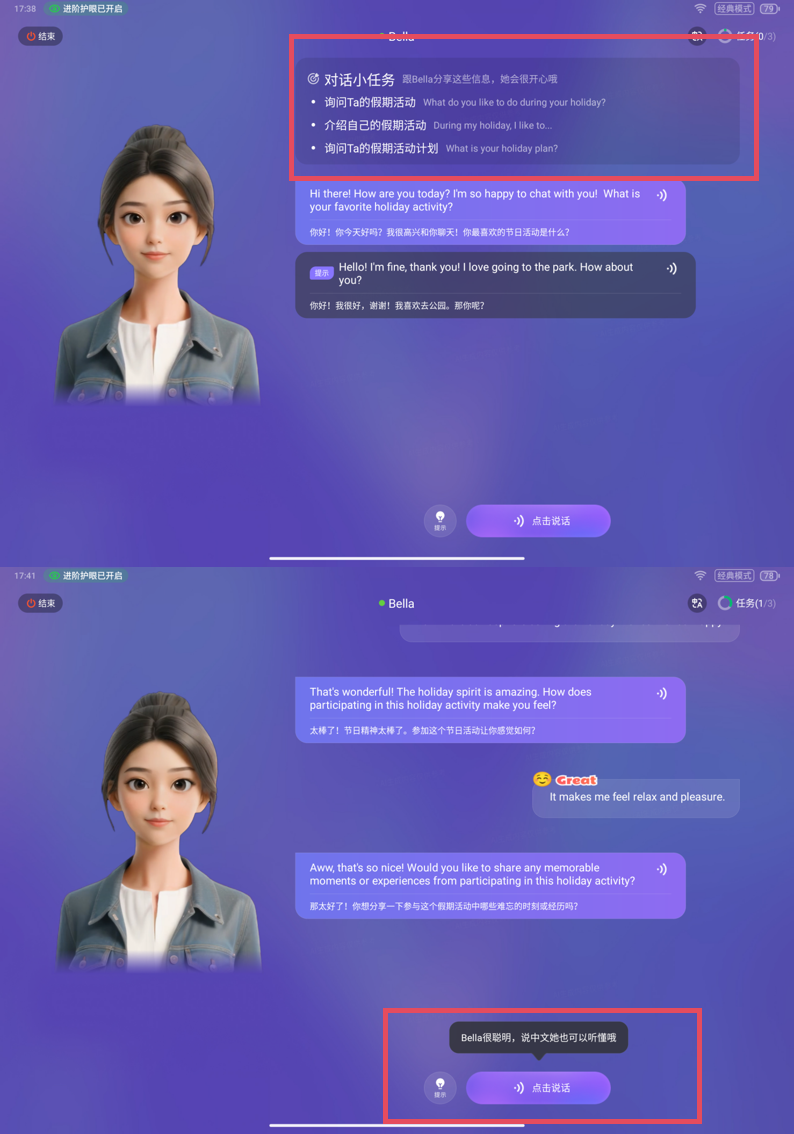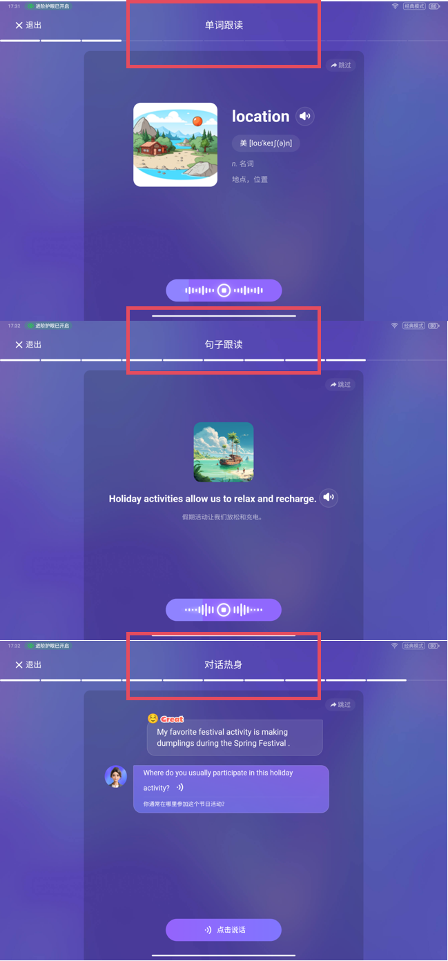 开始练习后,AI就会按步骤来引导孩子,不用担心张不开口。