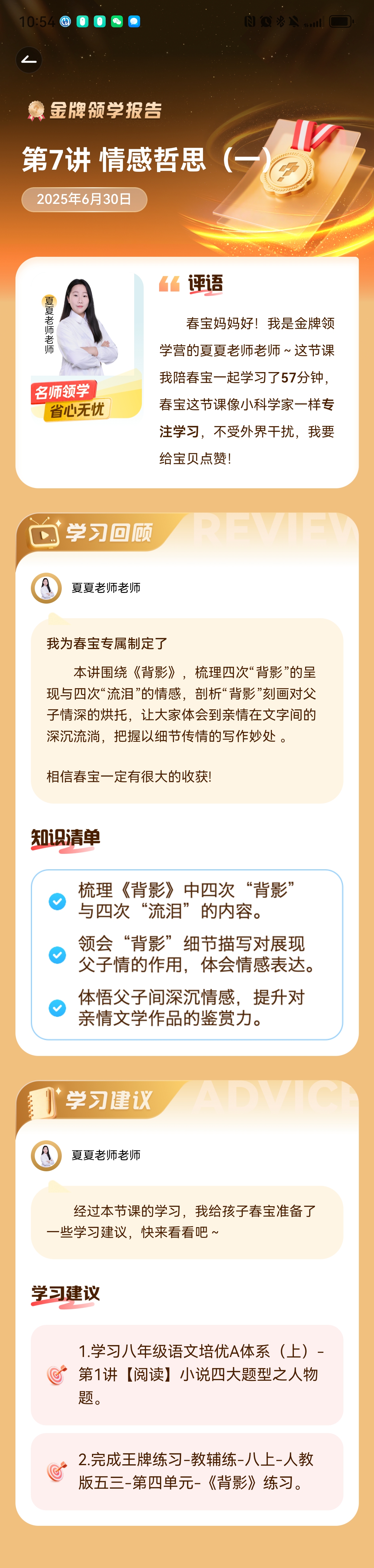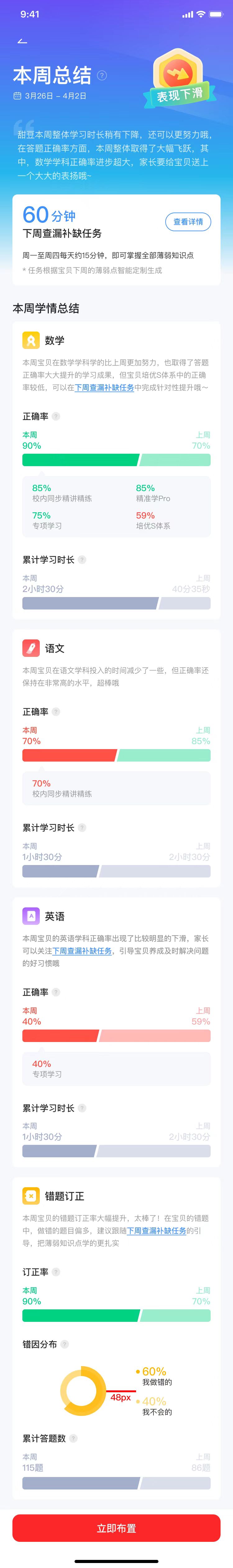 作业模式下,每一次任务的完成,家长端都会收到一份详细的学习分析报告,包括本次作业的完成情况、孩子的进步高光时刻、后续的提升建议,家长可以清楚地了解孩子的学习进步和潜在问题。
