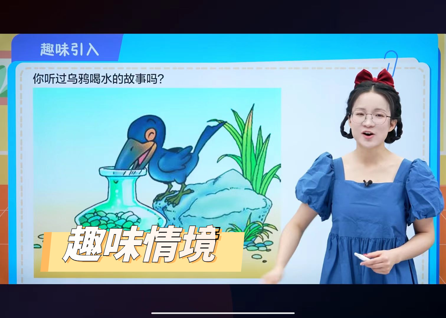 趣味引入环节,老师会先引入小学一年级上重点课文“乌鸦喝水”,通过回顾熟悉乌鸦为了喝到水,衔来石子投入瓶中使水位上升的情节,从而为后续知识讲解创设趣味情境,激发孩子学习兴趣。