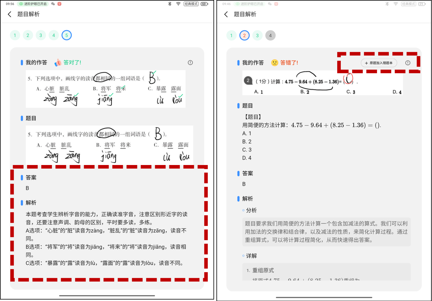 最重要的是,这一功能搭配了学而思10亿+题库,80% 视频覆盖讲解。批改过程中,学习机不仅会对每道题目标注对错,还会给出题目分析、详细解题思路以及方法点睛等关键内容。