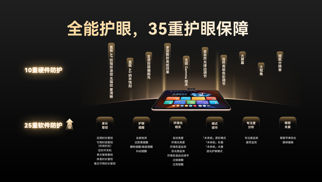 硬件:13.2 英寸无频闪不反光的未来纸润眼大屏,加上新一代智慧岛Pro的复合智能感知矩阵,能测亮度、测色温、测距离、测姿势,只要孩子离得太近、光线太暗、坐姿歪了或屏幕太亮,机器立刻自动调光、弹出提醒,把伤眼因素挡在第一步。