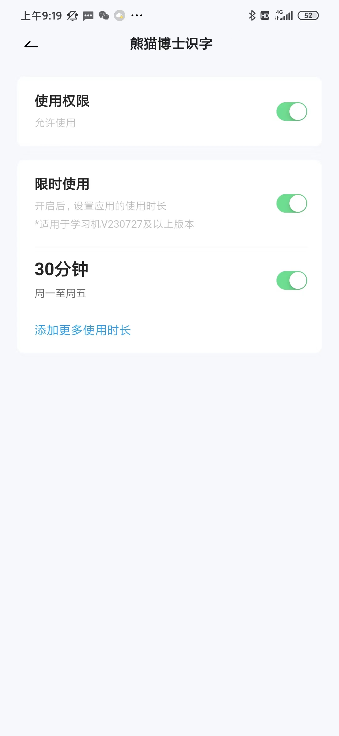 点击应用管理以后,可以对每一个APP的使用权限和时间进行单独设置,比如孩子在用熊猫博士识字软件学习汉字,每周一到周五学习,每次学习半个小时,家长就可以提前设置好,到时候自动就会锁住应用,更好地保护孩子的视力。