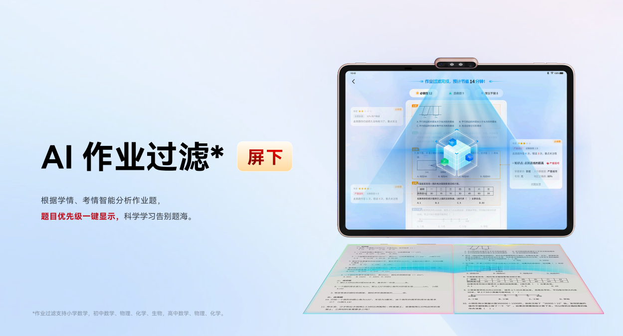 家长只要指导孩子一键拍照上传作业,学习机就能瞬间完成批改与讲解,不管是低年级的语数外英,还是高年级的物化生、史地政,都可以使用作业批改功能,轻松解决!