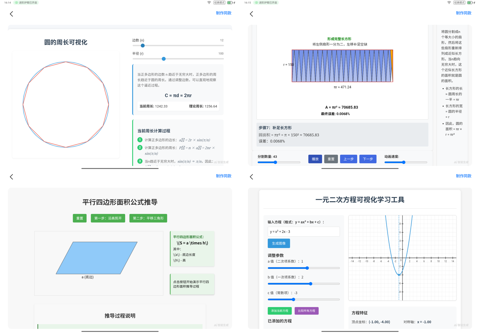 类似的数形结合的项目还有很多,比如圆的周长、面积公式的推导、平行四边形、梯形面积公式的推导,一元二次方程等等,对于这些无法直接触摸的抽象概念,小思工作坊都可以通过可视化工具帮助孩子建模,不光有助于理解,更重要的是这种探索的方式充满趣味性和成就感。