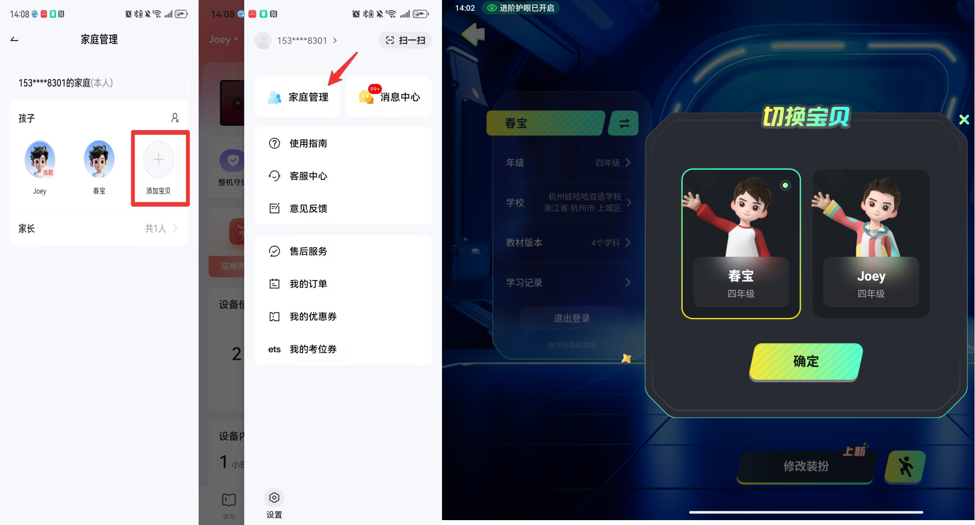打开【学而思亲子】app,点击【设备】-【家庭管理】,点击【添加宝贝】就可以新建账号,学习机端点击头像就可以自由切换。