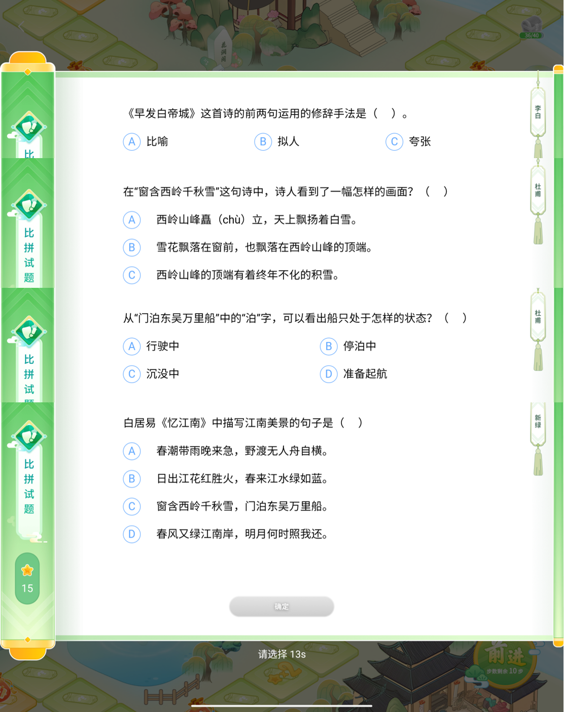所有格子都对应《义务教育语文课程标准》里的必背篇目和拓展名篇,背诵、解意、修辞、文学常识都包含了,孩子边玩边记,一局下来诗词量+鉴赏力双提升。