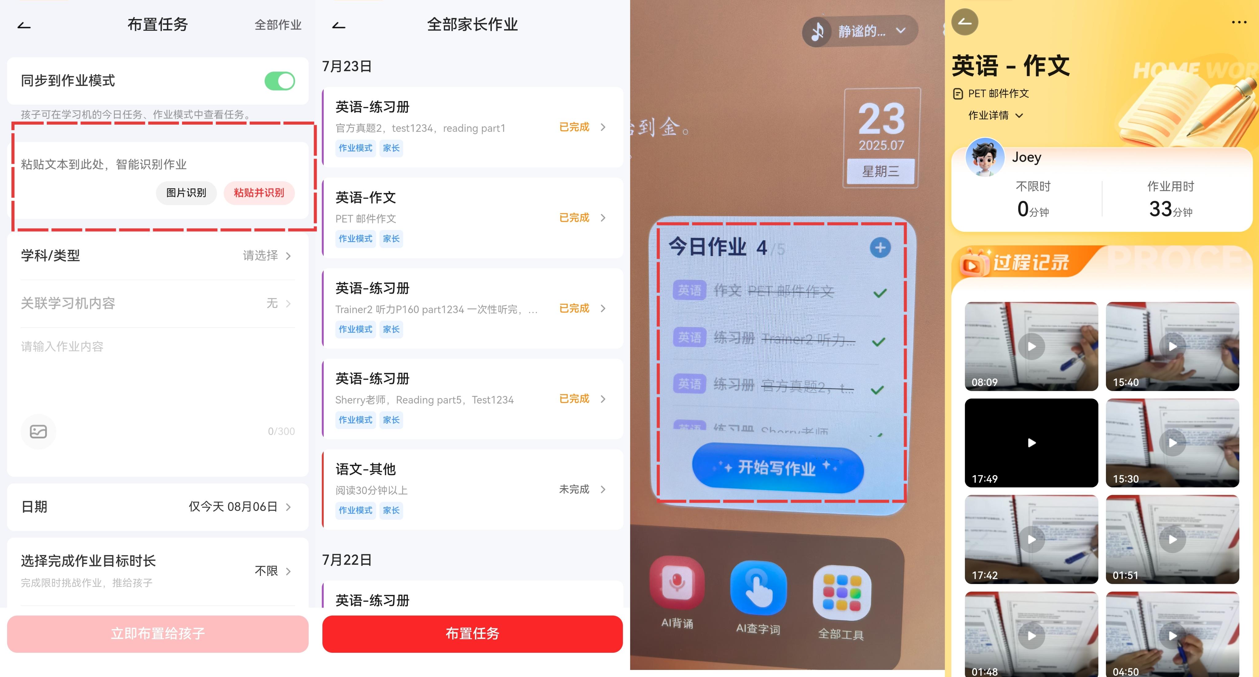 再比如说,前一秒收到老师布置的作业单,后一秒家长端复制粘贴到作业模式,孩子学习机上立马就能展现清晰的作业清单,有没有完成,完成用了多长时间,完成过程还有视频记录。