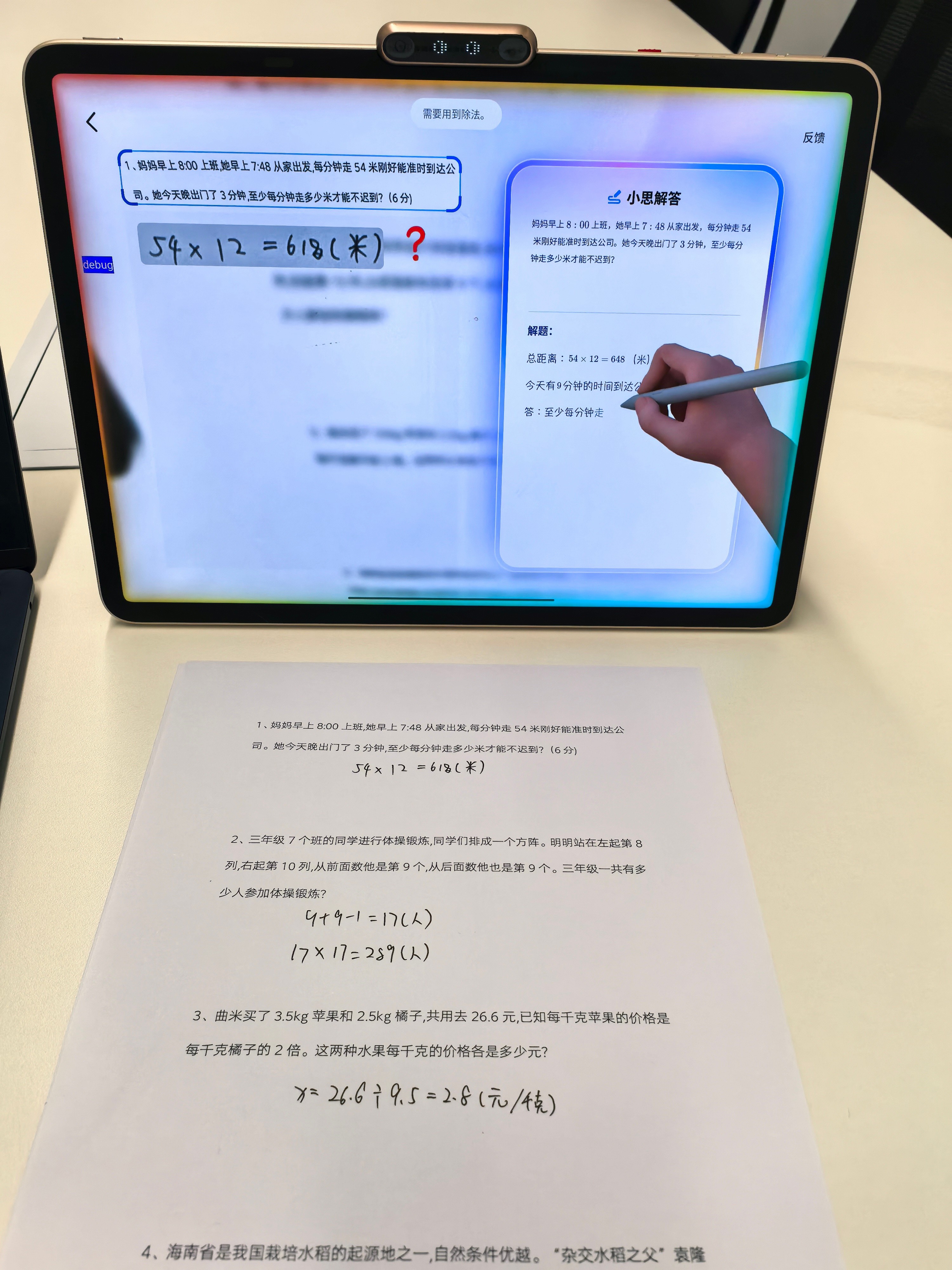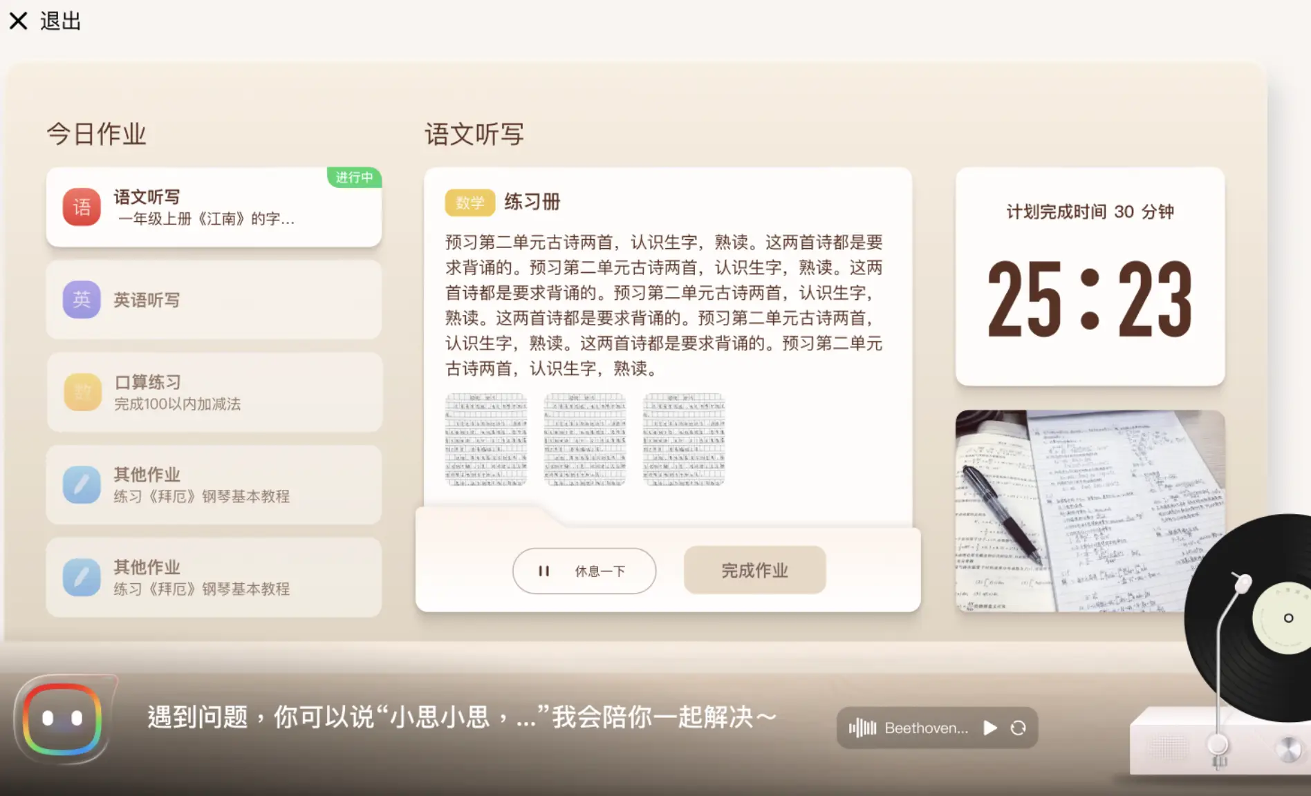 作业过程中“小思”AI 全程陪伴,如果写作业过程中遇到不懂的问题,随时可以呼唤“小思小思”,比如不认识的字和单词,小思可以给出提示,如果数学题不会,小思会给出思路引导并进行主动提问,帮助孩子解决问题。听写背诵、口算批改等原本需要家长参与的任务,小思也可以轻松完成。